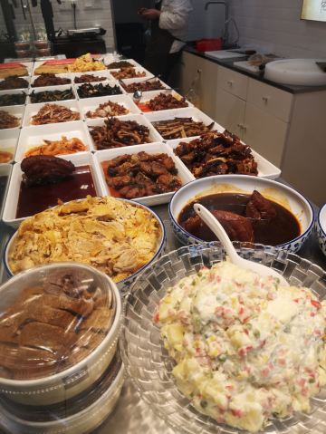 手撕鸡,苔条花生,香辣牛蛙,三黄鸡,老味酱鸭盐水牛肉色拉,熏鱼,糖醋小排,金瓜丝,酱牛肉,酸辣海带丝,八宝辣酱,走油肉