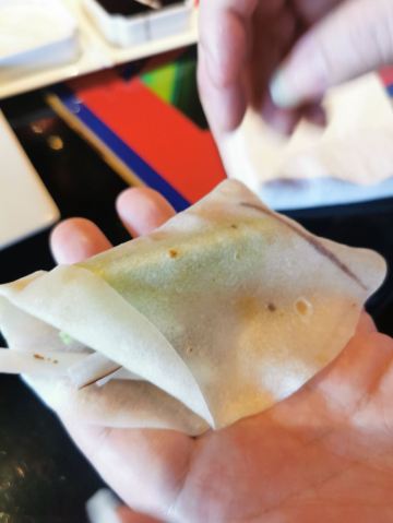 泡泡龙他爸这里有个不太好的地方,太幽暗,特别是过道。走在过道上经常冷不防从旁边某个包房窜出来一个服务生,不小心就会撞上去;同样,室内的灯光也偏暗,那些菜肴拍照效果也受影响。菜的选择比以前多,价格好像也上涨不少,包房可以自带酒水,但至少要点一瓶酒,就叫了瓶香槟大家Happy一下。三十年的中学同学,今年能坐在一起再聚聚真不容易,在海外的同学只能等明年了。窗外正对浦东陆家嘴,景色北侧漂亮,南侧则有太多外形挺难看的江边豪宅,估计还是看夜景更好看一些。全景照片盗了一张同学拍的,光注意聊天自己只随便拍了两张,但是位置不够好,景色不够完整,扇面也是同学自己手工做的。这次菜点的很足,价钱也不菲,有同学和餐厅老板还有店长是老朋友,餐厅送了道上海冰糕给大家尝尝。这次吃到最出色的还是传统豆沙方糕,以前从来没吃到过。
