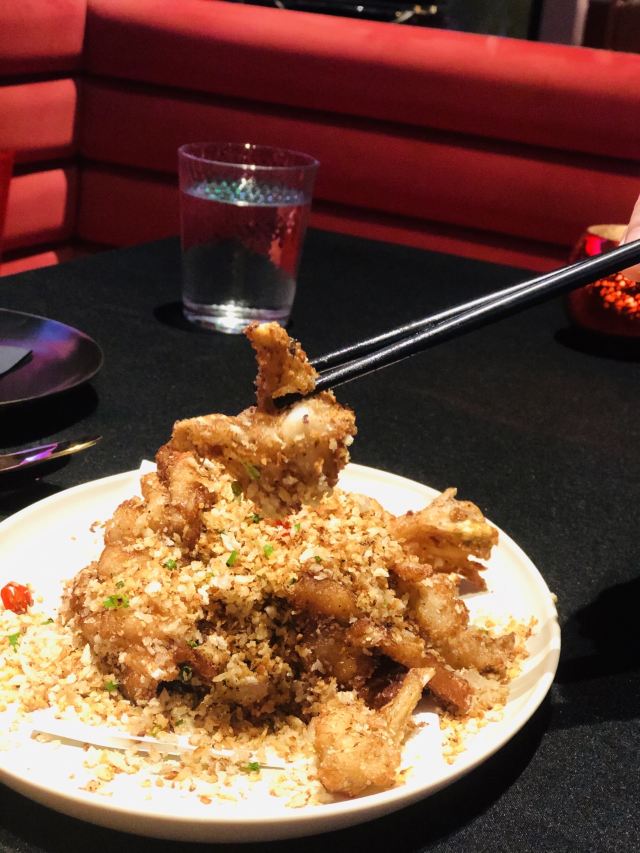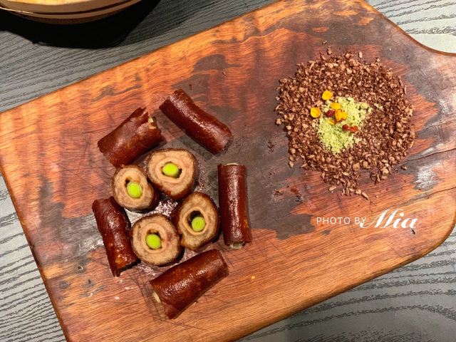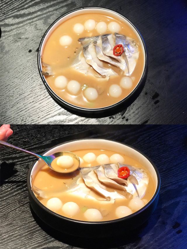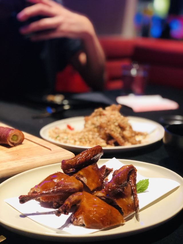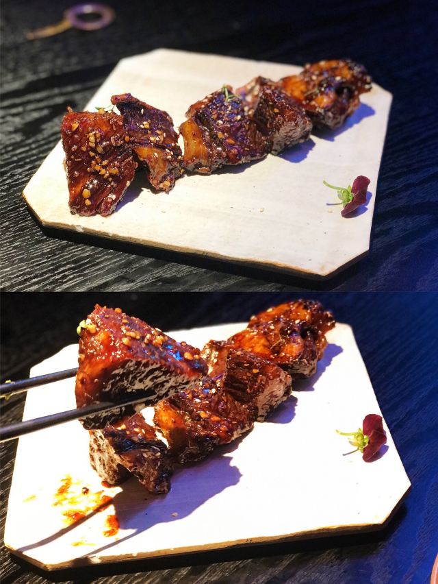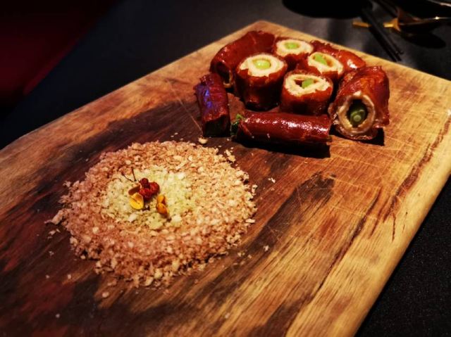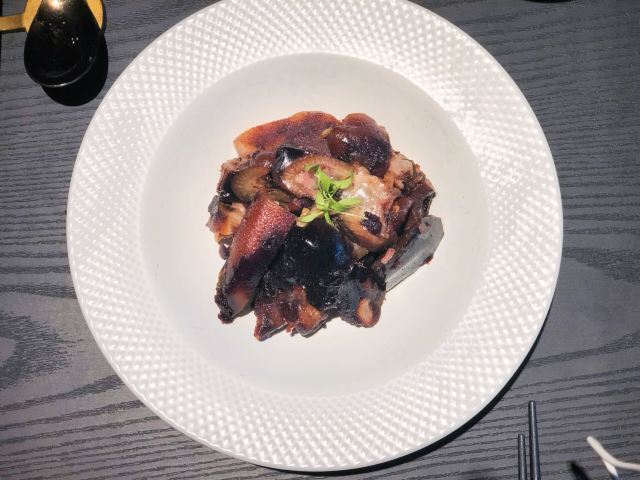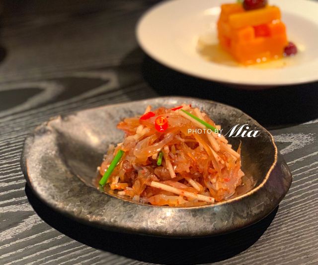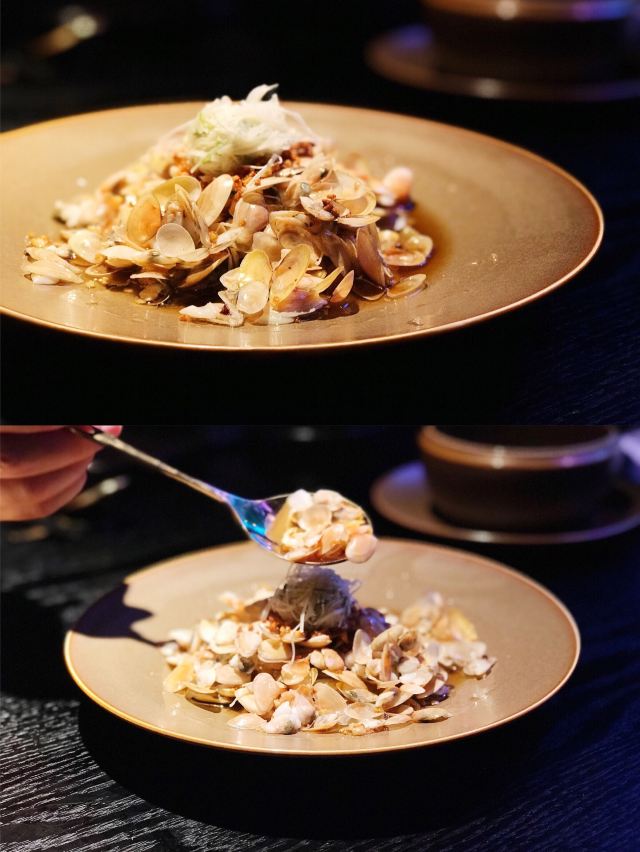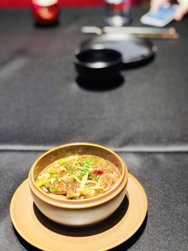 秃比不是小刘鸭幽暗的环境,隔断之间流光溢彩的🐟金鱼投影,比起中餐厅,更像是一间时髦🍸酒吧,让人沉迷于其中。 「朗姆酒茶叶鹌鹑蛋」☑小巧可爱的茶叶鹌鹑蛋被盛在咖啡豆木盒中端了上来,旁边有只🐦小鹌鹑。加入了朗姆酒慢煮出来的鹌鹑蛋带着特别的香气,极为入味。 「沙蒜豆面」☑沙蒜即海葵,豆面即红薯粉丝,沙蒜的融合,让普通的粉丝沾染了一丝鲜美。不加一滴水,用得都是沙蒜的汁水,因此酱汁十分浓稠,裹在豆面上,浓郁鲜香。 「台州年糕烧东海鲳鱼」☑每天新鲜运送东海🐟白鲳鱼,无需任何调料加持,本身的鲜味就足够。鱼肉鲜嫩。长的像鱼丸的年糕球,小巧可爱韧性十足。 「香酥澳洲小牛肉」☑牛肉品质上乘,外层有一层酥壳,内层则鲜嫩多汁,层次分明的口感再加上配好的复合味型酱汁,有惊喜的味道。