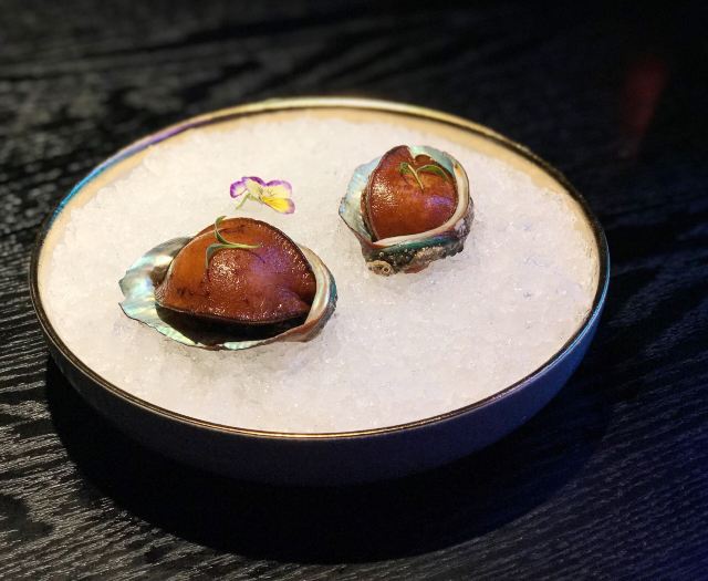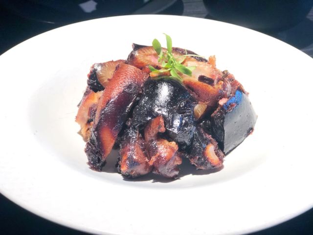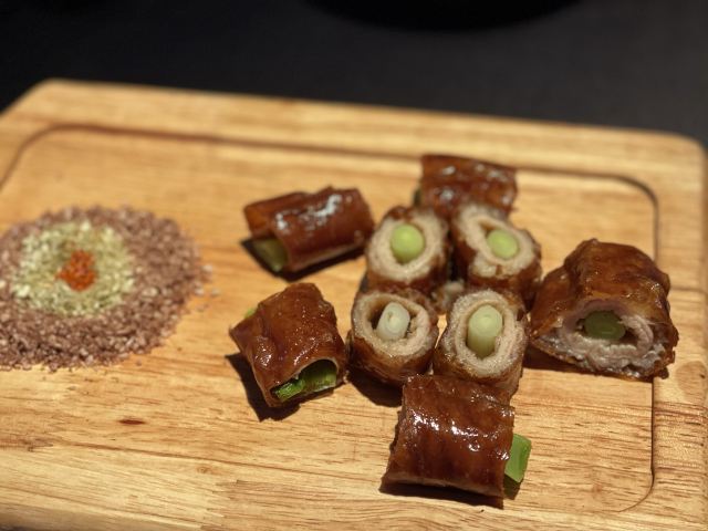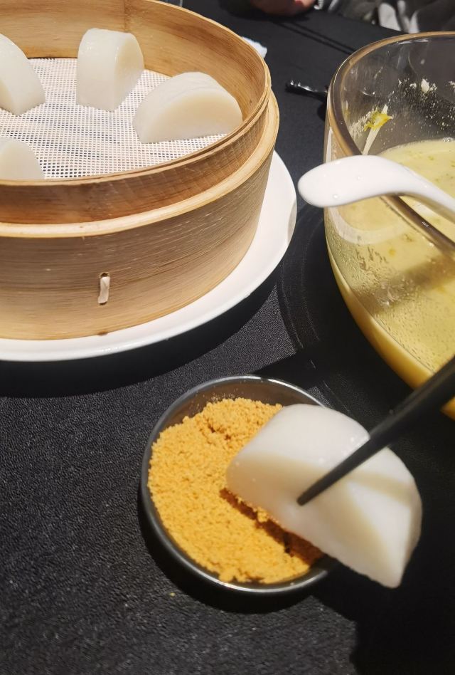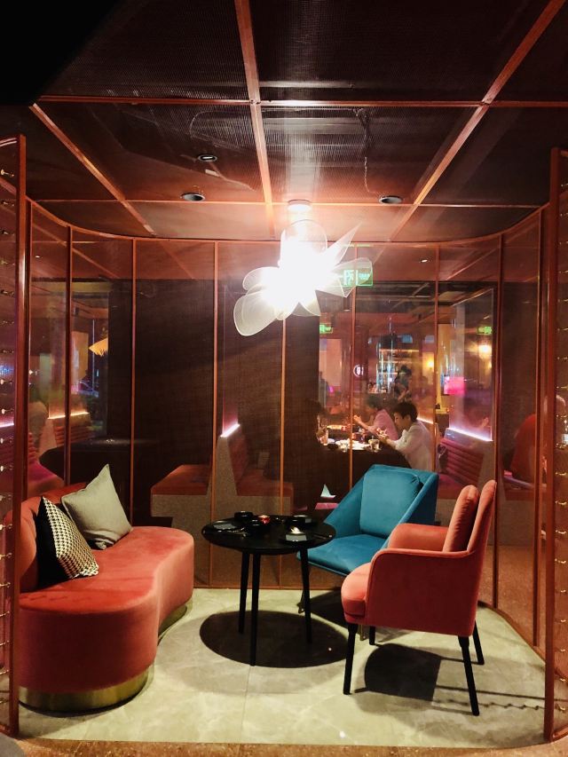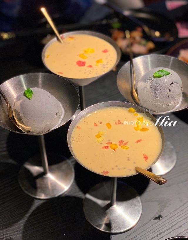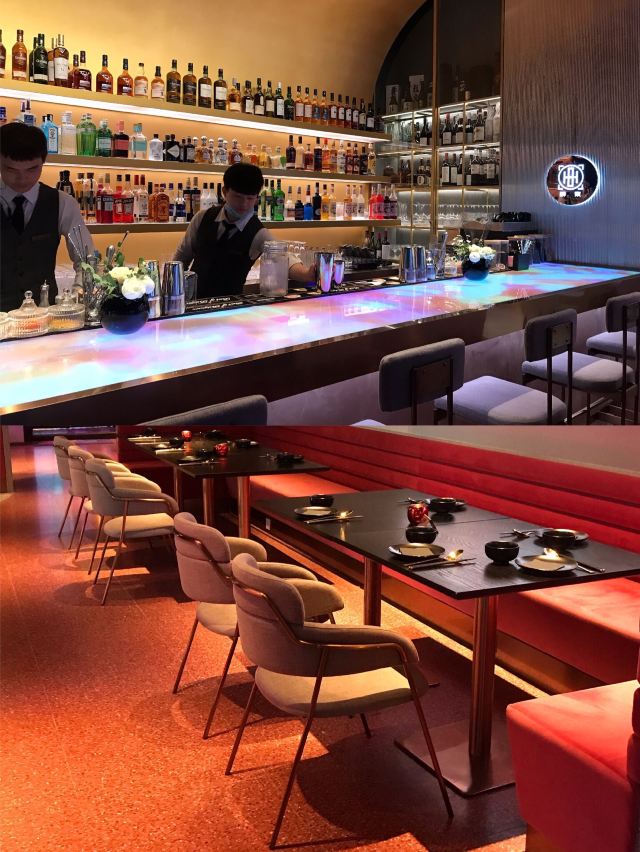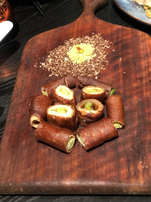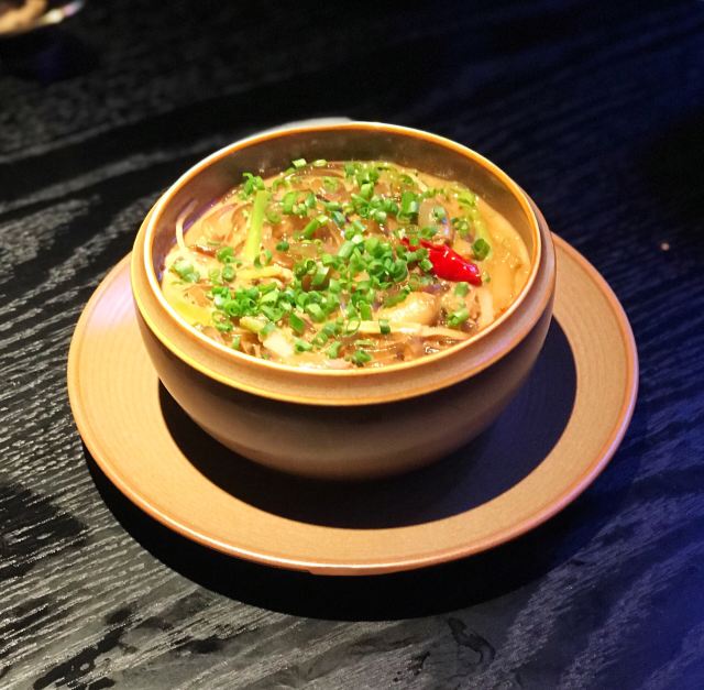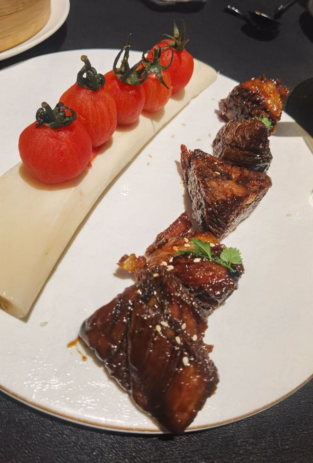 秃比不是小刘鸭幽暗的环境,隔断之间流光溢彩的🐟金鱼投影,比起中餐厅,更像是一间时髦🍸酒吧,让人沉迷于其中。 「朗姆酒茶叶鹌鹑蛋」☑小巧可爱的茶叶鹌鹑蛋被盛在咖啡豆木盒中端了上来,旁边有只🐦小鹌鹑。加入了朗姆酒慢煮出来的鹌鹑蛋带着特别的香气,极为入味。 「沙蒜豆面」☑沙蒜即海葵,豆面即红薯粉丝,沙蒜的融合,让普通的粉丝沾染了一丝鲜美。不加一滴水,用得都是沙蒜的汁水,因此酱汁十分浓稠,裹在豆面上,浓郁鲜香。 「台州年糕烧东海鲳鱼」☑每天新鲜运送东海🐟白鲳鱼,无需任何调料加持,本身的鲜味就足够。鱼肉鲜嫩。长的像鱼丸的年糕球,小巧可爱韧性十足。 「香酥澳洲小牛肉」☑牛肉品质上乘,外层有一层酥壳,内层则鲜嫩多汁,层次分明的口感再加上配好的复合味型酱汁,有惊喜的味道。