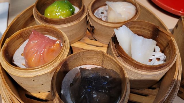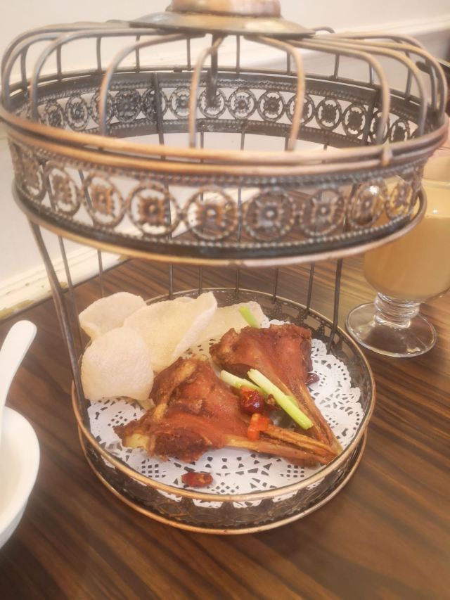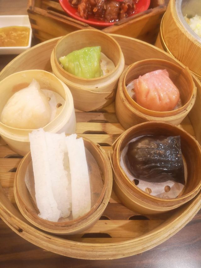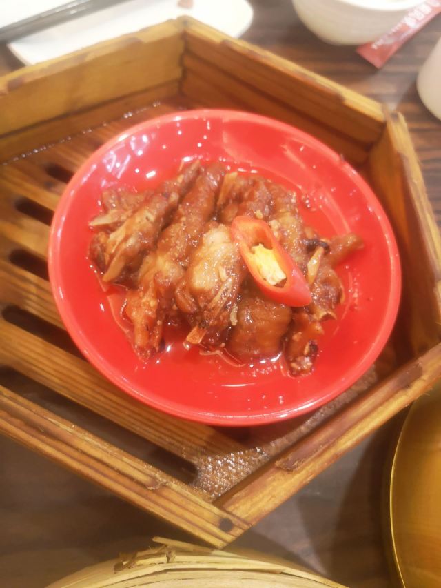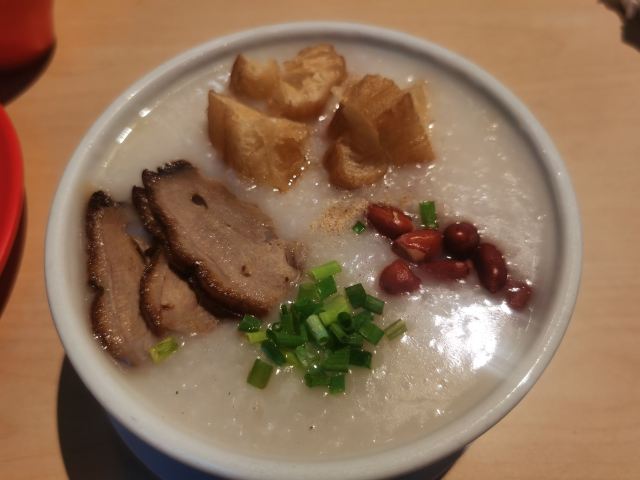 Zhu JiaZhuang Bifengtang (WuJiaoChang)老牌的港式茶餐厅,国庆节午市人还蛮多的,领号排队开始以为要等蛮久,没想到很快就开出一片新的就餐区落座。 照旧扫码点单,桌子餐具清洁的不是很干净,只好用餐巾纸再擦一下。 上餐的速度蛮快,明火瑶柱白粥17元绵厚的白粥里夹杂着细细的干贝丝,拌上橄榄菜香润鲜美。 避风塘八仙艇仔粥29元,加入了香咸酥松的烧鸭片提升了粥的味道,鱼片、虾仁、鱿鱼、肉丝等配料众多口感鲜浓。 避风塘大虾饺皇37元,个头真的大皮滑莹润蟹籽点缀,虾肉弹嫩饱满多汁鲜香。 蜜汁叉烧肠粉32元肠粉薄滑莹亮,叉烧细碎酥嫩,但是放入了脆网酥有点油耗气反而不好吃。 V5-V8打卡收藏赠送霸王酥皮叉烧包12元,酥皮很粉脆,叉烧馅细酥甜蜜。店长还贴心的换送了牛油菠萝包12元,酥粉松软牛油香鲜。 餐点的味道很好,价格适中。环境不错整洁度还需提高,服务态度亲切细致及时周到。