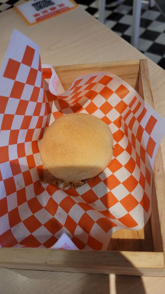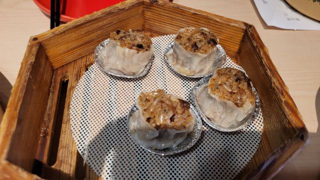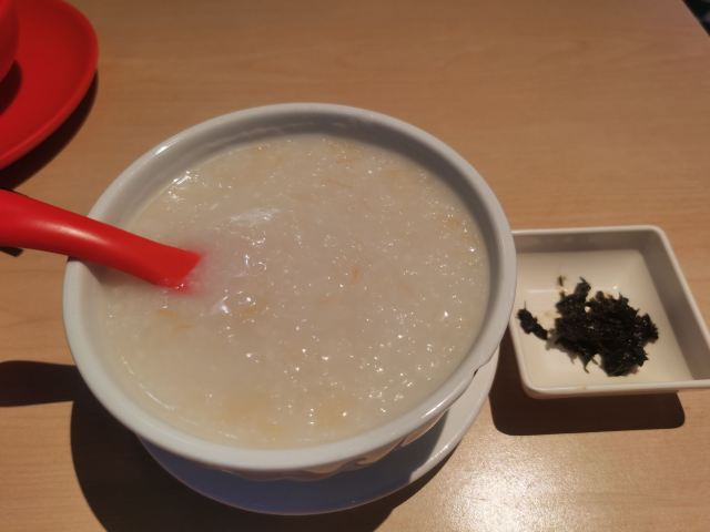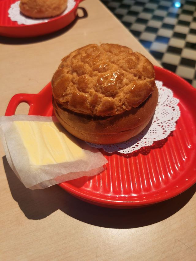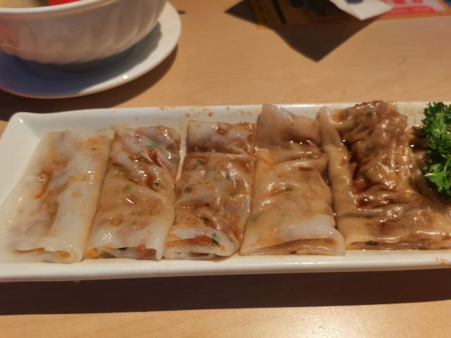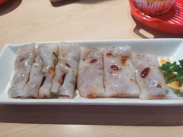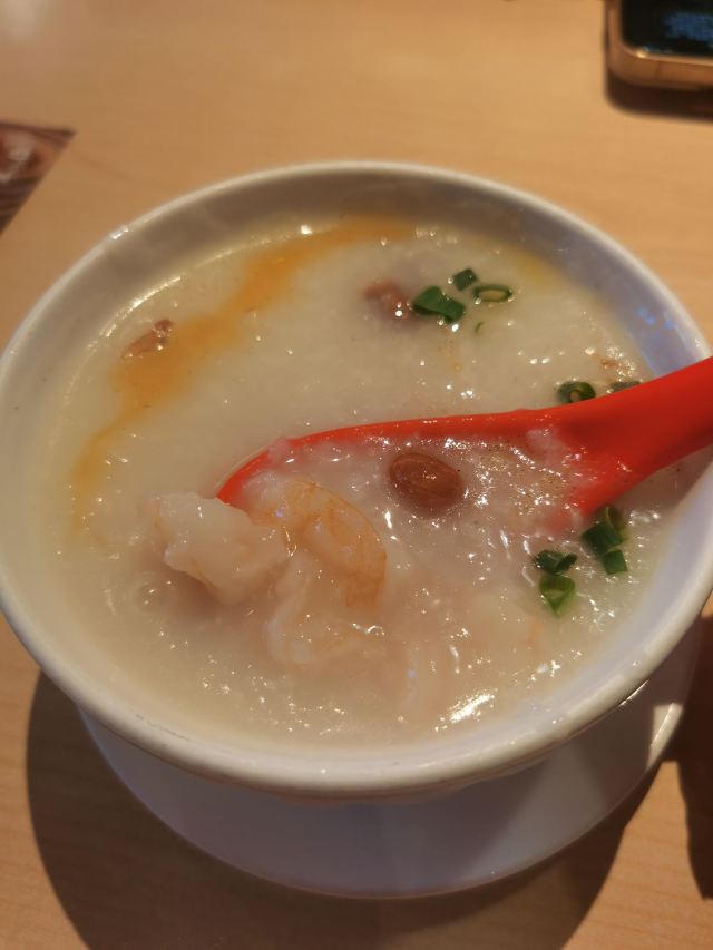 食神牛老牌的港式茶餐厅,国庆节午市人还蛮多的,领号排队开始以为要等蛮久,没想到很快就开出一片新的就餐区落座。 照旧扫码点单,桌子餐具清洁的不是很干净,只好用餐巾纸再擦一下。 上餐的速度蛮快,明火瑶柱白粥17元绵厚的白粥里夹杂着细细的干贝丝,拌上橄榄菜香润鲜美。 避风塘八仙艇仔粥29元,加入了香咸酥松的烧鸭片提升了粥的味道,鱼片、虾仁、鱿鱼、肉丝等配料众多口感鲜浓。 避风塘大虾饺皇37元,个头真的大皮滑莹润蟹籽点缀,虾肉弹嫩饱满多汁鲜香。 蜜汁叉烧肠粉32元肠粉薄滑莹亮,叉烧细碎酥嫩,但是放入了脆网酥有点油耗气反而不好吃。 V5-V8打卡收藏赠送霸王酥皮叉烧包12元,酥皮很粉脆,叉烧馅细酥甜蜜。店长还贴心的换送了牛油菠萝包12元,酥粉松软牛油香鲜。 餐点的味道很好,价格适中。环境不错整洁度还需提高,服务态度亲切细致及时周到。