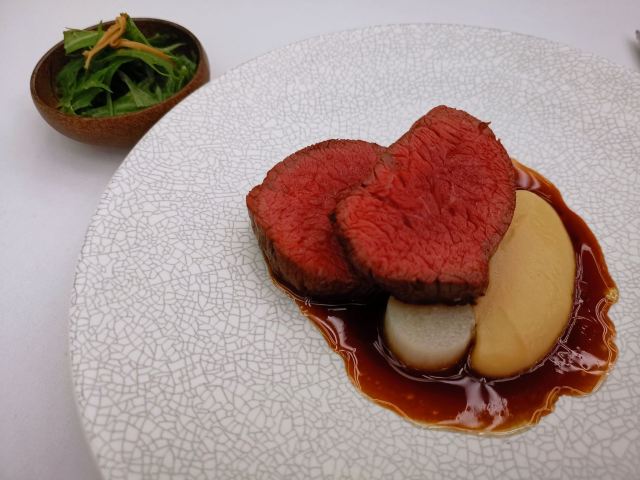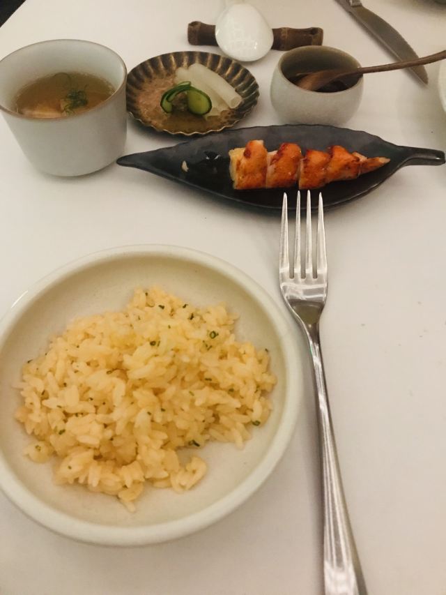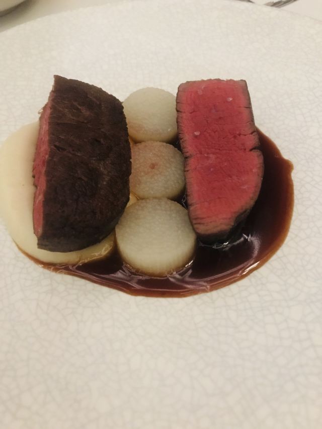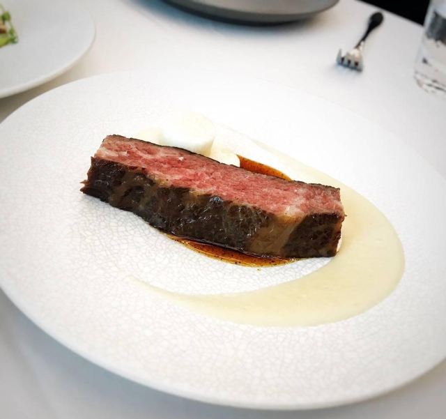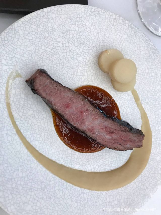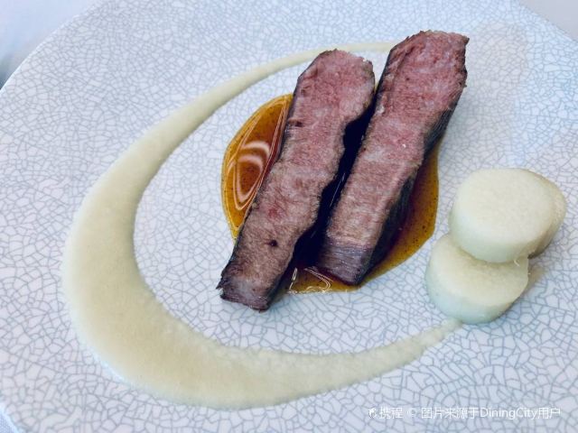 澳洲M9和牛,美国prime牛小排,珍伊比利亚猪肉,海胆意面,扇贝,烤鸭,餐前面包配黄油及Marille杏酱,自制黄油面包,春。黄瓜色拉,树莓柠檬蛋糕,鲍鱼汤,烤春鸡配冬笋牛肝菌,梅干菜惠灵顿牛排,梅干菜惠灵顿,东星斑酸菜泡饭,鸭肝三重奏,春鸡,鳟鱼,谷。波士顿龙虾配香米及XO酱,桂花车厘子刨冰,黑松露竹蛏,欢。海盐焦糖花生巧克力,樱桃酱冰沙配桂花及车厘子