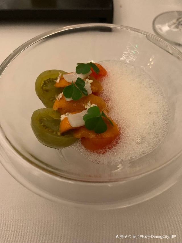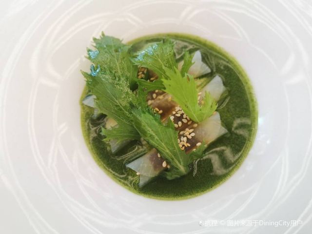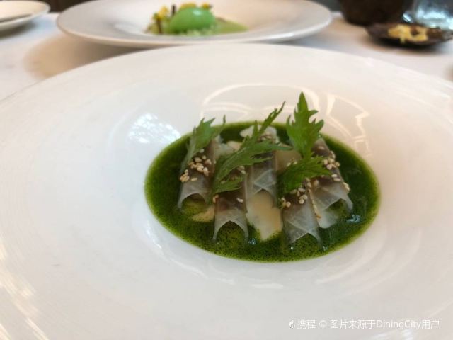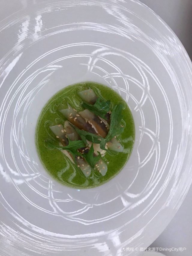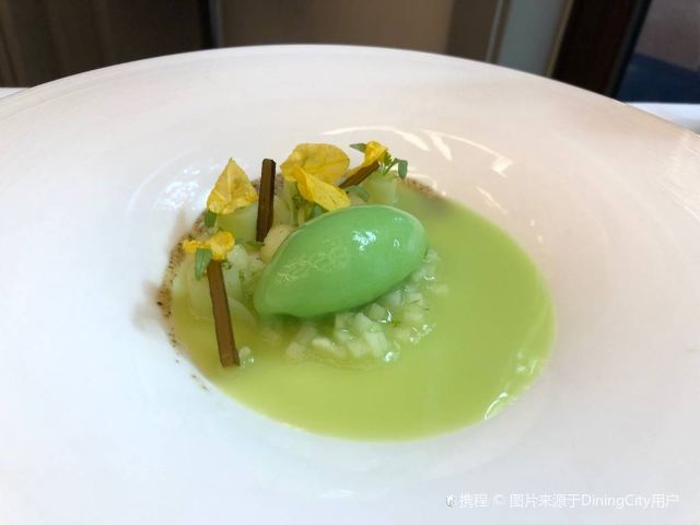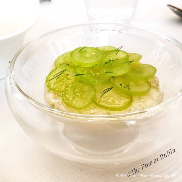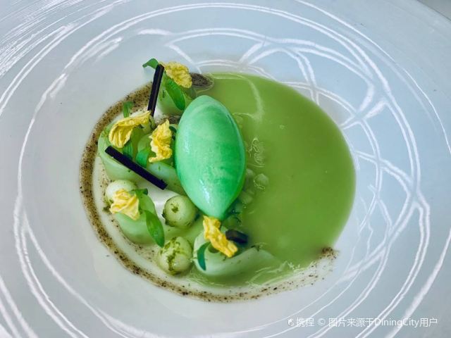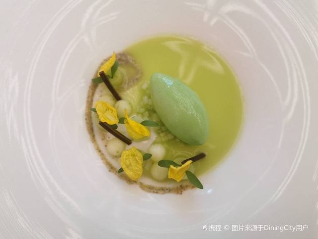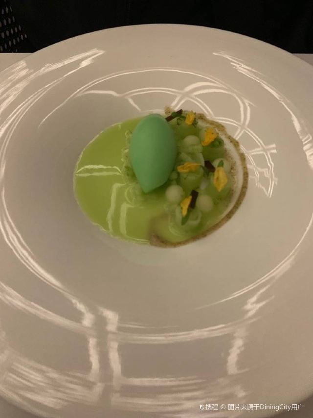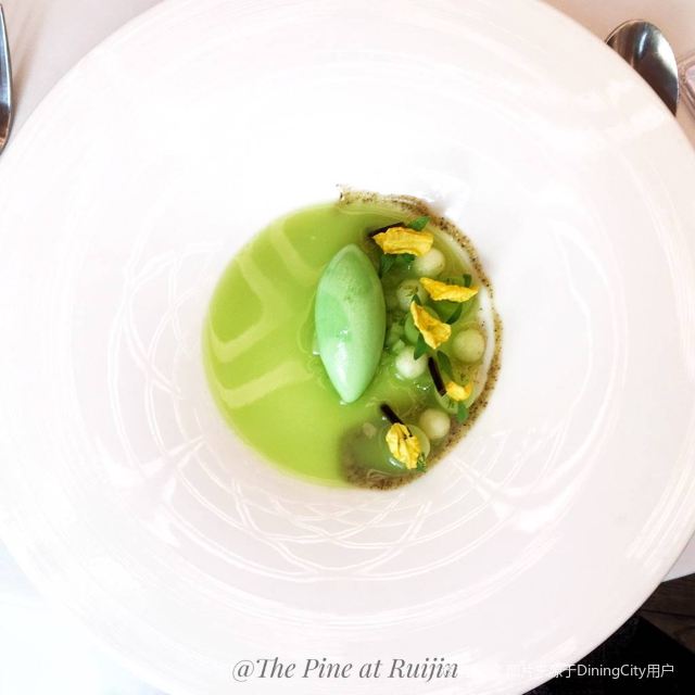 YoYo_5E3W4A0N开启餐厅周,因为pine at Ruijin去年给我留下了美味的回忆,今年第一家就选了它。实际如何呢~ 开胃小菜一上来就知道主厨没换,黄瓜香菜海带配的绿色冰淇淋,可以有。不过腌的白萝卜口味就普通了点。 前菜的三文鱼核桃芥菜卷只能说略平淡,洋姜浓汤配的松子倒是不错。 主食春鸡蚕豆,作为主食实在是一般了点。黑松露手工面配的羊肚菌,1我不大喜欢黑松露2我不大喜欢宽面。喜欢的人估计会觉得还可以。 餐后的玫瑰冰沙,跟曾经吃过的其他味的冰沙好像不太好比。 甜品维持了一贯的水准。 经理很客气的加了微信,说以后上新菜可以通知来试试。还给了2小时停车券。 这次还送了杯马爹利,餐厅的杯子还是瞿广慈的浮雕天使杯,实在是很有品味了。还是留一次期待给下次……