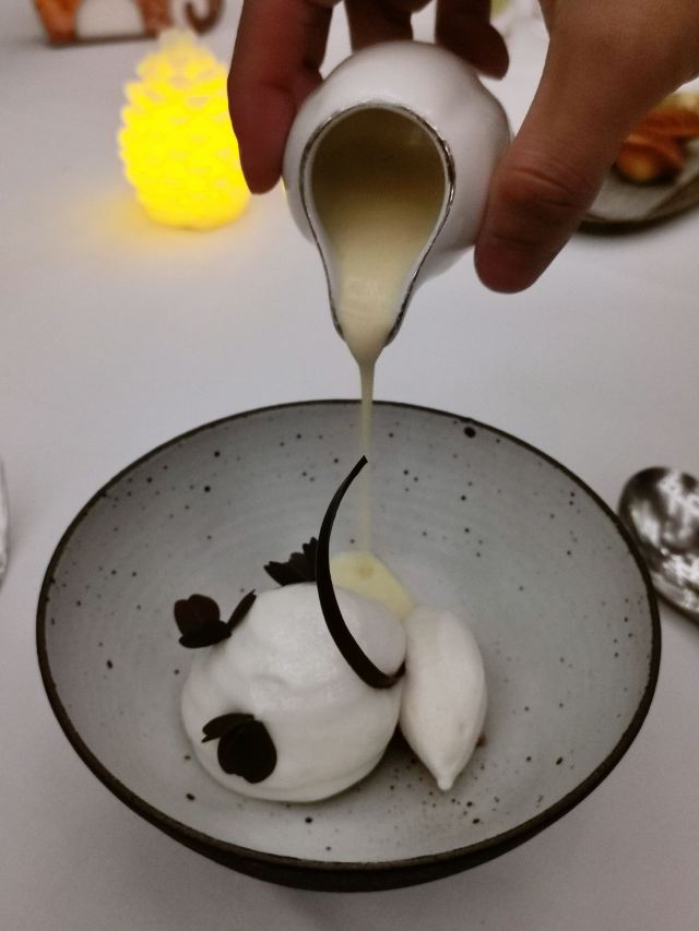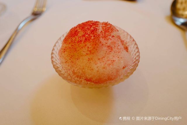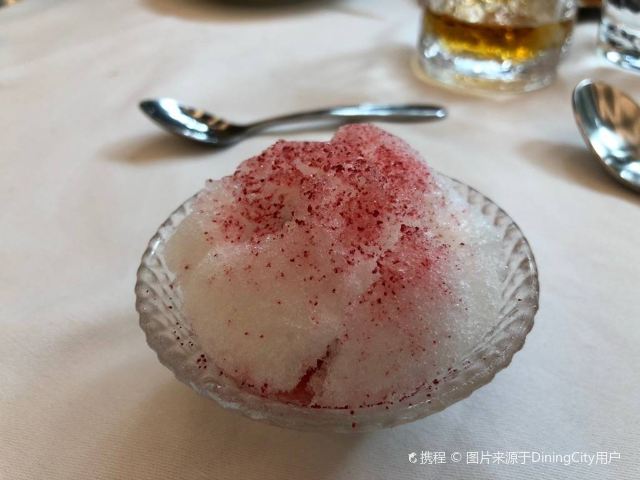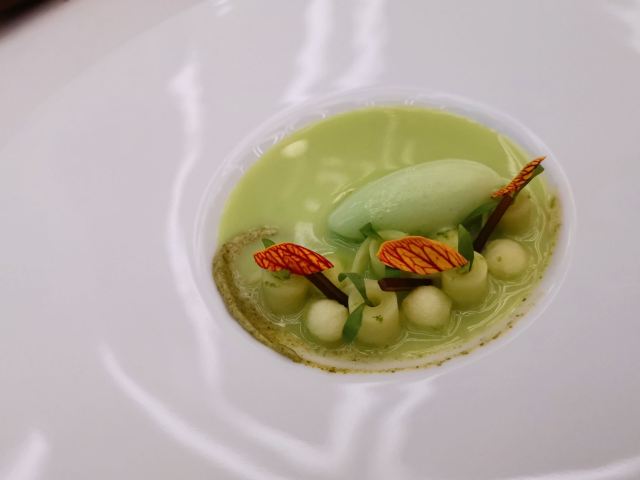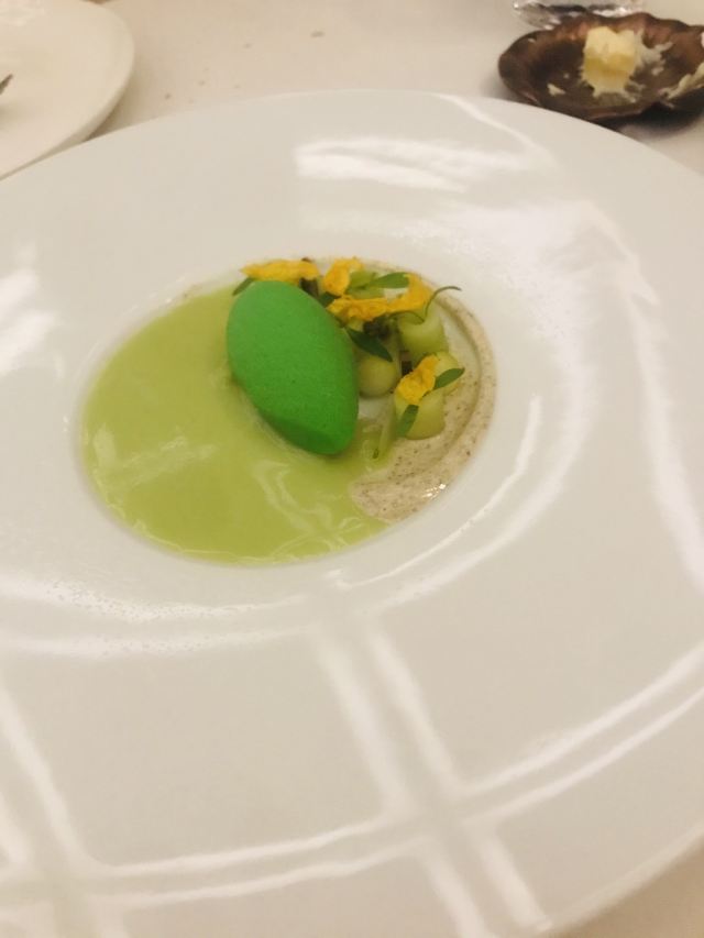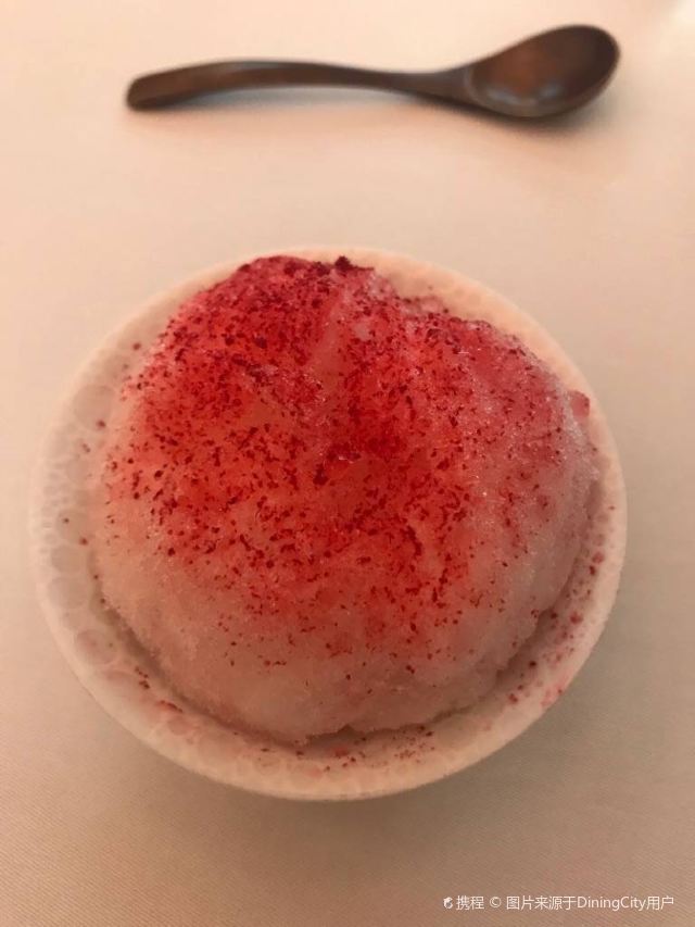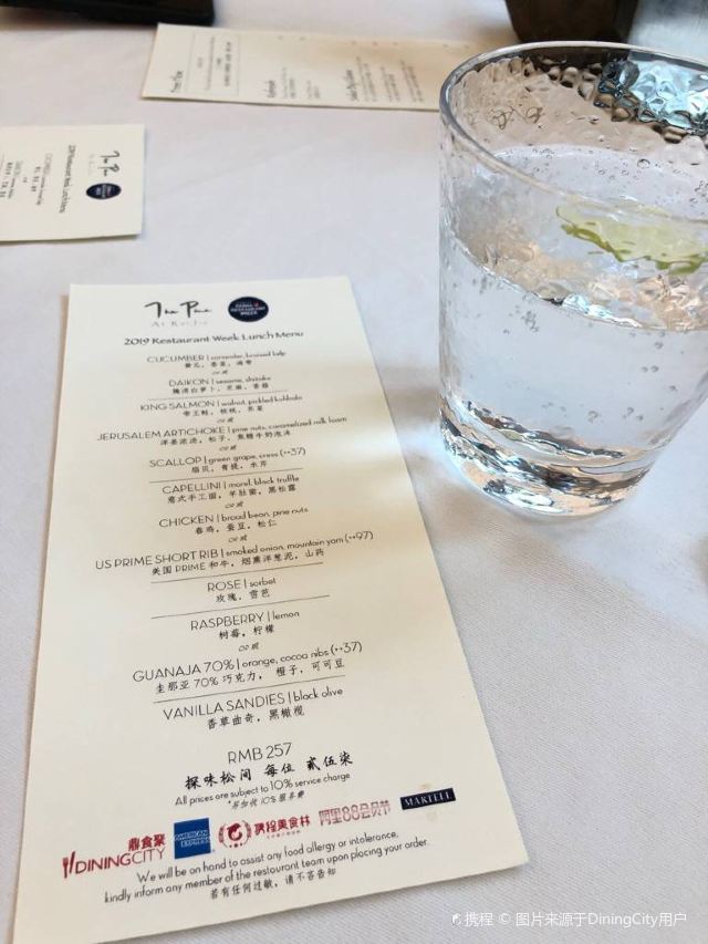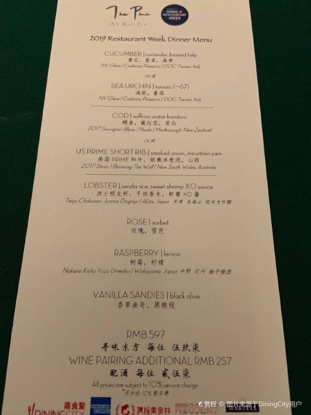 YoYo_5E3W4A0N开启餐厅周,因为pine at Ruijin去年给我留下了美味的回忆,今年第一家就选了它。实际如何呢~ 开胃小菜一上来就知道主厨没换,黄瓜香菜海带配的绿色冰淇淋,可以有。不过腌的白萝卜口味就普通了点。 前菜的三文鱼核桃芥菜卷只能说略平淡,洋姜浓汤配的松子倒是不错。 主食春鸡蚕豆,作为主食实在是一般了点。黑松露手工面配的羊肚菌,1我不大喜欢黑松露2我不大喜欢宽面。喜欢的人估计会觉得还可以。 餐后的玫瑰冰沙,跟曾经吃过的其他味的冰沙好像不太好比。 甜品维持了一贯的水准。 经理很客气的加了微信,说以后上新菜可以通知来试试。还给了2小时停车券。 这次还送了杯马爹利,餐厅的杯子还是瞿广慈的浮雕天使杯,实在是很有品味了。还是留一次期待给下次……