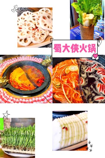 贵妃牛肉,大侠水牛毛肚,鸭血,大刀肝片,铝箔烧酥肉,炸豆皮,虾滑,番茄鸳鸯锅,舌尖上的蜀大侠,蜀大侠火锅,自助调料,秘制美极牛蛙,功夫土豆片,神仙肥牛,鲜鸭血,水牛毛肚,大满足牛肉双人餐,太极双滑,红糖糍粑,一米牛羊组合,花千骨,深海海带芽,冰淇淋,冰川鹅肠