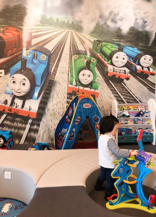 小元元麻麻🚂呜呜呜!打卡托马斯亲子餐厅咯,走到餐厅门口就能看到托马斯玻璃窗贴,扑面而俩的蓝色托马斯主题! 🚂进门三部曲:宝宝有专用小凳子洗手🧼、量体温🤒️、脱鞋🛅,大人换拖鞋就可以入场。婴儿车可以直接留在门口,服务员会帮忙停好。 🚂进入餐厅以后全蓝色系布置、充满了托马斯元素,喜欢托马斯小火车的宝宝真的会无法自拔😂。餐厅整体是L型,就餐区域就在中央。这家的菜单偏向正式西餐,菜式、类别比其他亲子餐厅多,摆盘考究味道不错,但是走精致路线量不大的哟。 🚂餐厅一角有独立的小童玩耍区域,连接着沙池。在另一边,则有海洋球池和滑梯。沿着餐厅走,会经过托马斯轨道小火车,满墙模型大人看到都要走进多看两眼。 🚂餐厅走到底就是过家家、厨房、开小火车的区域。也是满满的托马斯小火车玩具,简直是托马斯迷的天堂。 🚂这家餐厅虽不大,游乐区边上却有配套的母婴室🚼和洗手间🚻,这样的设计很人性化,当然这里也是满墙的托马斯小火车主题啦。 📍坐标:金虹桥商场4楼(5号电梯直达) 🏠地址:上海市长宁区茅台路179号 🈺️开放时间:10:30-21:00 🚇公交:地铁2号线娄山关路站 🅿️停车:地下车库10元/时,会员消费50元免2小时