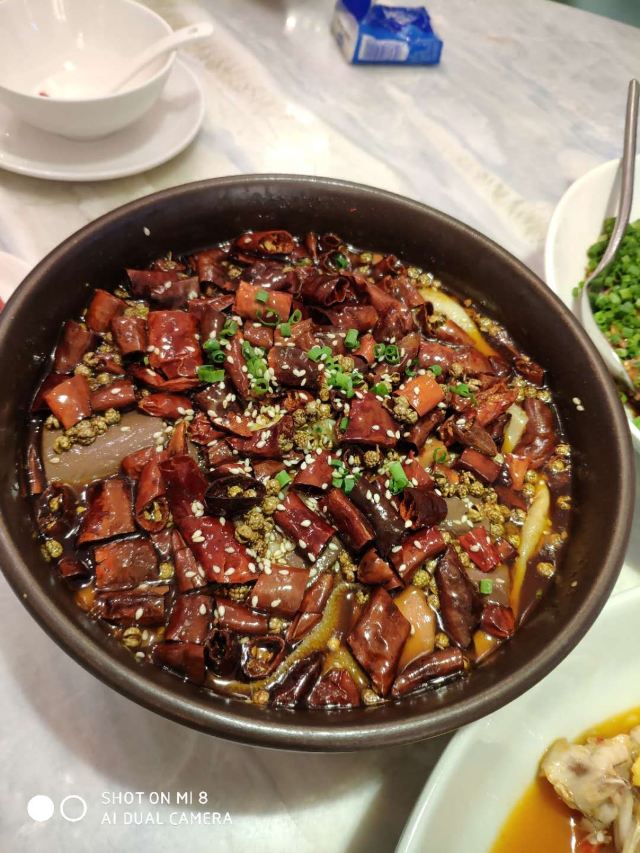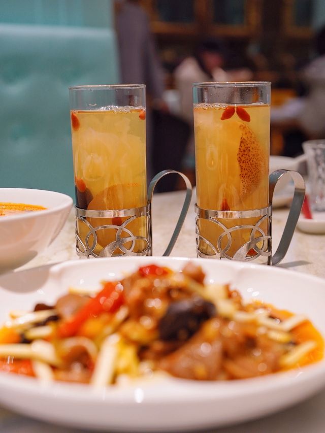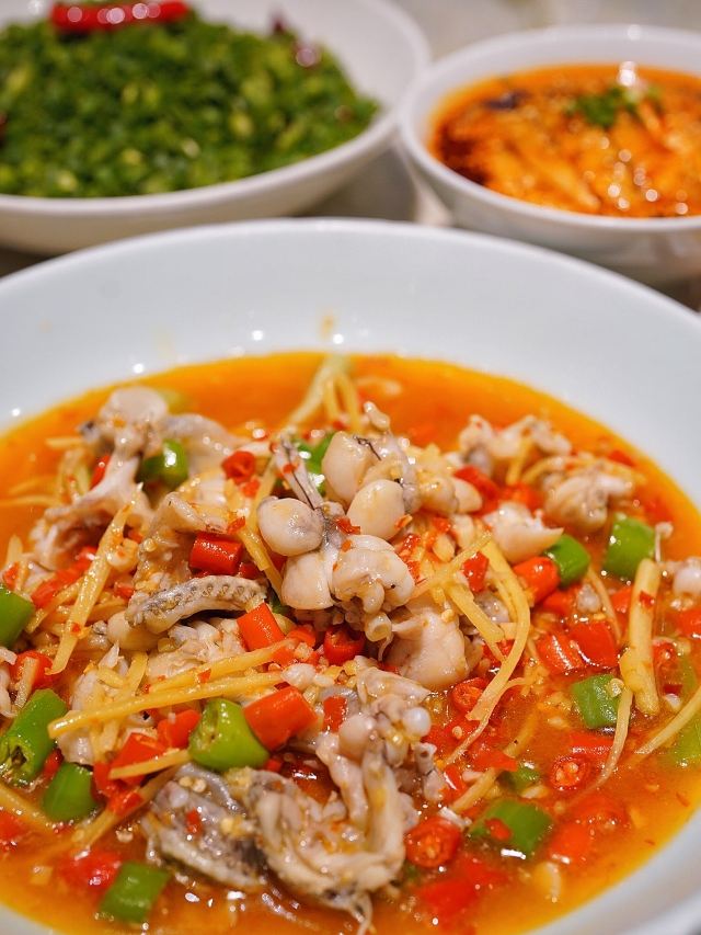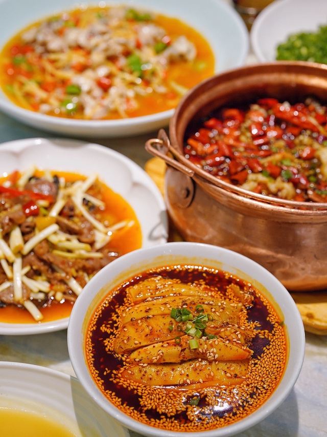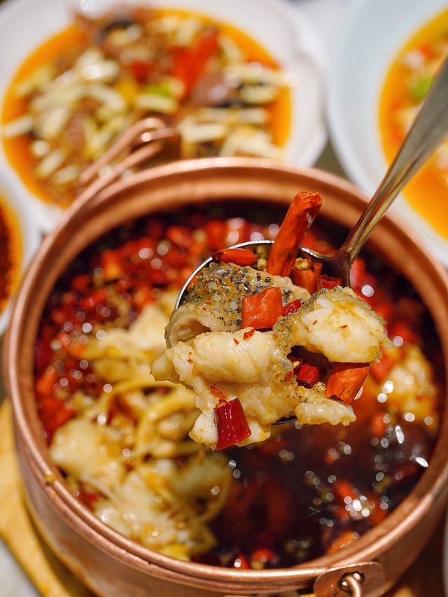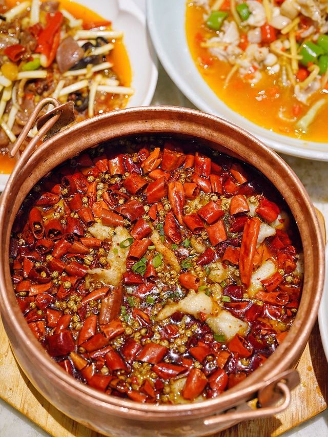 加油干饭呀能把唯美艺术和热辣川菜完美融合,恐怕只有🦚孔雀川菜🦚做到了‼️跟重油重辣自带江湖气的川菜不同,从视觉到赏味都散发着高端雅致的气息,又不失川菜风味。 魔都zui 美川菜,算是把水煮鱼玩明白了‼️🐟沸腾水煮龙趸鱼🐟选用深海龙趸鱼,活鱼现杀一整个大动作,每日新鲜到店,每一口都是极致鲜活,鲜嫩爽滑的鱼片,吸饱辣意汹涌的汤汁,仿佛在你舌尖冲浪🌊 ⚠️团购套餐只要¥256,竟然比单点还要便宜呢‼️ 🐸盐帮仔姜蛙蛙跳🐸 完美演绎极嫩极鲜,有这么大一堆麻辣料相佐,浅尝一口就欲罢不能,还有咸香适宜的🐔乐山藤椒鸡🐔,手撕鸡肉口味地道,带你一筷子伸到乐山 满满一桌火辣辣的川菜,当然“梨”不开🍐孔雀雪梨汁🍐的治愈,搭配枸杞银耳熬成羹状,润喉舒肺的同时还能解辣解腻,真是再适合不过了。 精致舒适的轻奢川菜,每次来孔雀都能有愉悦的体验,也刷新了我对川菜的认识,传统的川菜味型搭配新鲜食材烹饪,川菜也可以如此精致细腻阳春白雪~