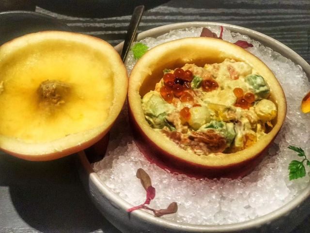 史先生与黛小姐「醉東」2022入围餐厅,主打台州菜系。 每次路过都看到他家那队排的叫一个长,都没能最终吃上。这次直接提前电话预约了位置[调皮] 📍地址:虹桥路1号港汇恒隆广场北座5F-540号 🅿️港汇恒隆停车场 [服务铃]服务:总的来说还是很到位的,全程递茶送水的,骨碟也换的很勤。 「一个苹果」 第一次被这家店吸引的就是因为这道很直白菜名,一个苹果。初体验,真是内有乾坤,创意满满的苹果色拉。 「蚵仔煎」 个人比较喜欢吃,中规中矩,觉得是一道不会出错的菜品。 「香酥小牛肉」 并不像点评中说的那么神,炸完以后外层肉质有点硬。还有淋的酱汁过于咸了。 「醉东炸鸡」 一直以为炸鸡应该是肯德基里的那种样子。这个炸鸡感觉更像烤鸡。味道是相当不错,肉嫩味美,而且鸡肉汁水丰富,绝对是必点菜。 「年糕烧鲳鱼」 鱼肉非常新鲜,没有腥味。旁边摆盘的年糕,口感超像 みたらし団子,特别特别喜欢呢。 「黄鱼春卷」 本来想着点他家招牌黄鱼的,可惜已点了鲳鱼,故换成了黄鱼春卷。炸的是外脆里嫩,恰到好处。一口下去,满嘴的黄鱼肉,那叫一个爽啊。