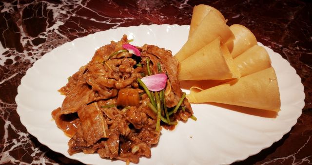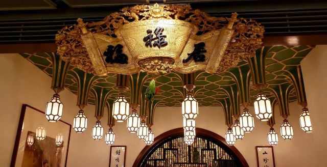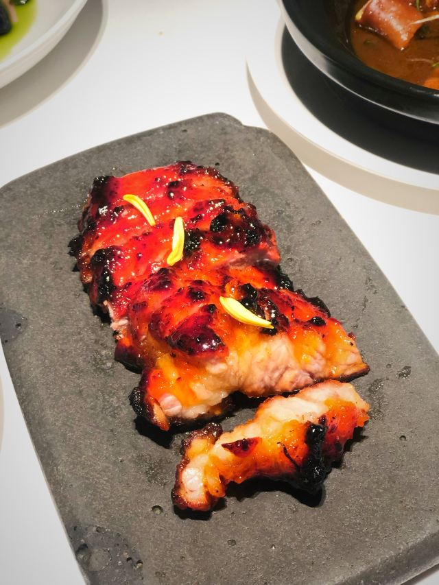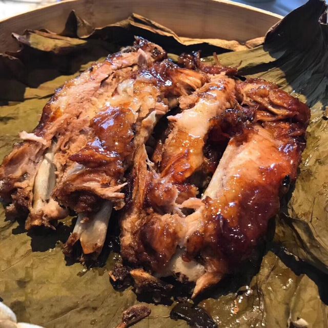门口竖立的福禄寿三仙人、满墙的百子柜让餐厅显的喜庆,陶瓷玉器等装饰品也点缀了这里的高雅之气。招牌的鸿运烤乳猪如此娇俏,皮脆肉香,质地很有嚼劲。