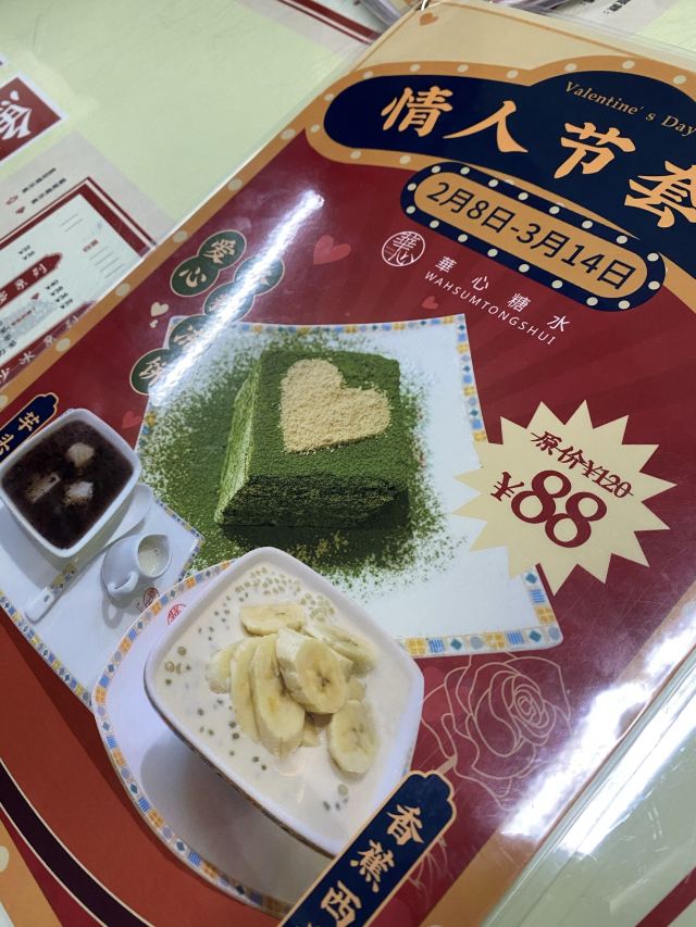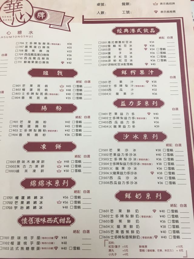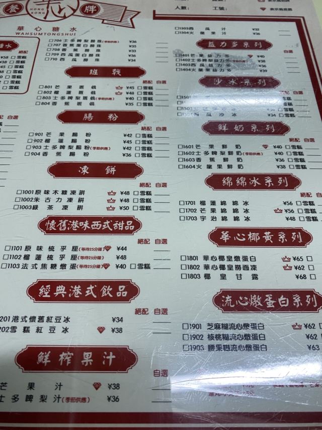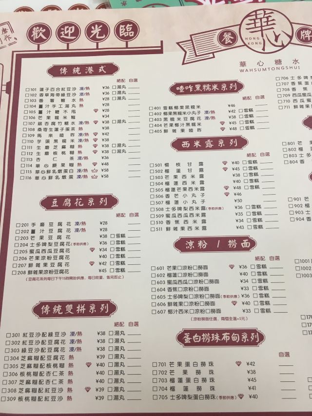 華心腰果糊,蛋白杏仁茶,楊枝甘露,原味木糠凍餅,華心鮮乳燉蛋白,杨枝甘露,生磨芝麻糊,红豆沙芝麻糊双拼,原味梳乎厘,糖不甩,芒果班戟,原味木糠冻饼,朱古力凍餅
