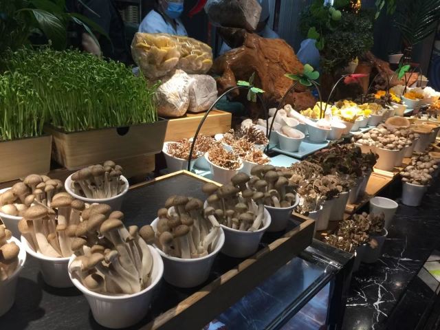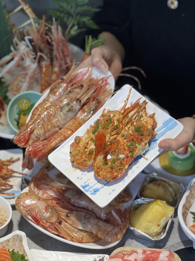 Dudelsack小伙伴被抖音上的烤榴莲圈粉,于是中午来找我一起拔草!提前电话预约,提示要中午12点前到,后来才知道下午2点收摊,限时2小时。 人比较多,两人需要拼桌。要求餐费预付,说了等小伙伴来付款,半小时里还是催了我很多次…索性就付了吧。298/人~ 锅底有清汤和麻辣可选,要了清汤的,看着像高汤,但其实是淡的。调料自助~ 十三香小龙虾,居然是我今年第一次吃的小龙虾!还算新鲜,就是有点冷了,口味可以。 烤鳗鱼,也冷了,但是部位不错~ 铁板鹅肝,需要排队。没啥很喜欢鹅肝就没要。 铁板小青龙,也是需要排队的,每人每次只能拿一份(半只),不过如果看到出锅的挺多,后面的队伍不长,可以再排一次,这样一次可以拿两份!小青龙品质不错,新鲜!但蒜蓉的口味一般般,没盒马烧的好吃。 花胶鸡汤,花胶没有炖烂,还是挺鲜的! 生的小青龙晚市才有,午市不提供! 鲍鱼,非常大只!想当满足! 濑尿虾,欧,活的!!!在盘子里还在蹦哒的! 拿了一只蟹盖,真的是满满的全是蟹黄! 帝王蟹脚,也要稍稍排队,1,2人吧,拿了两次,一般吧,感觉蟹腿的品质没小青龙新鲜… 烤榴莲,确实很好吃!不过不要拿一整大块的,会比较干,要拿卖相不好的,软软的,口感一流! 曲奇奶香冰淇淋,好吃!不甜~ 巧克力慕斯,也好吃!苦苦的,巧克力味浓郁~ 饮料选择茫茫多,鲜榨果汁,倒了杯草莓汁,好喝!再拿了个不能错过的椰青,甜! 水果选择也多,不过车厘子不好吃,不甜,西瓜还行,红毛丹不错,就是剥起来吃力… 刺身其实有蛮多,牡丹虾很大只,不过我还是没吃,帮小伙伴拿了一份。 服务阿姨很勤快,因为桌子很小,一有空碗就会帮你拿走,换骨碟也是! 因为口罩放裤子袋袋里掉了,临走的时候问收银台要了一个。 嗯,还想再来,虽然胃口不大,吃自助不太划算…
