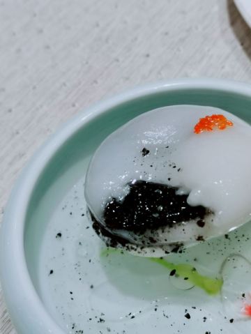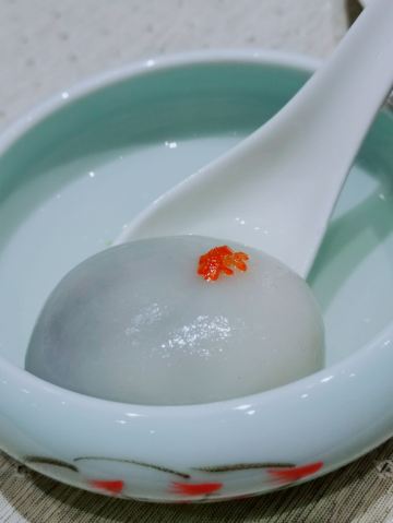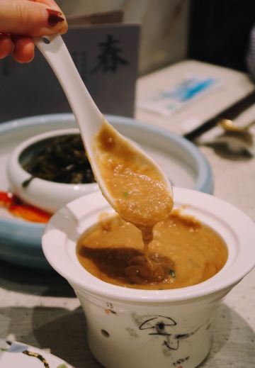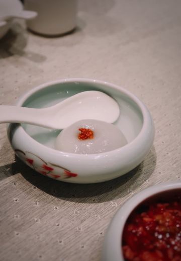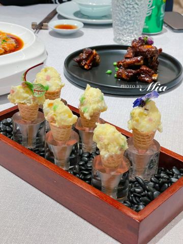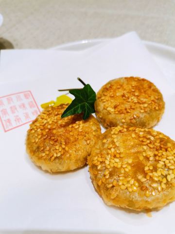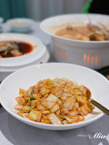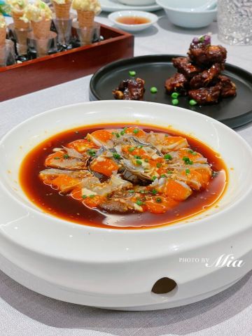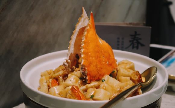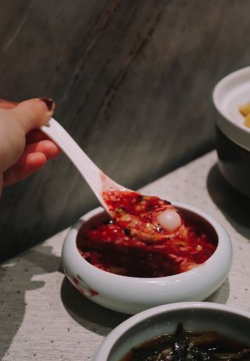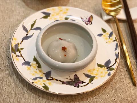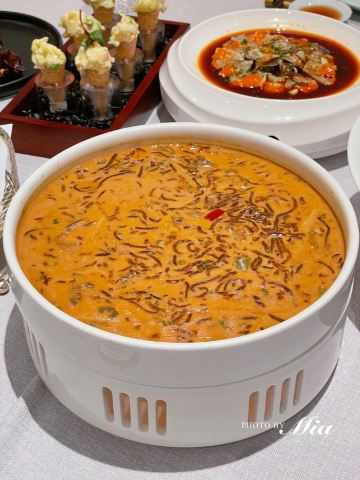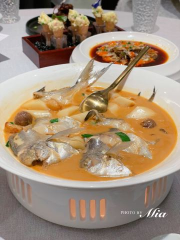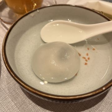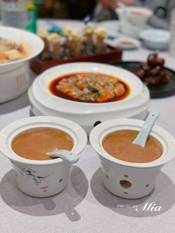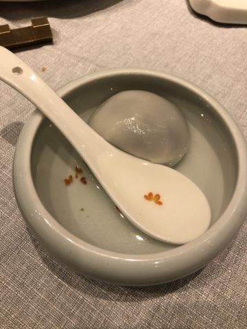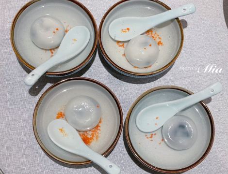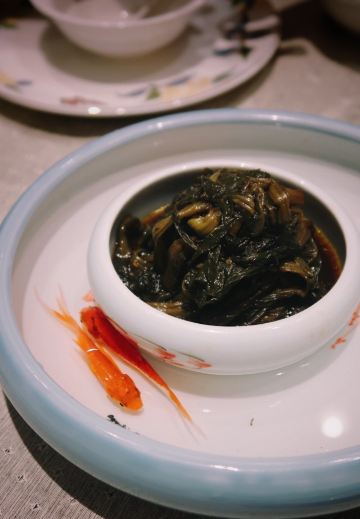 轻轻的一个蚊▫️白蟹酱炒年糕|这道菜里的两样食材刚好是我和我妈的最爱。我妈我负责解决蟹肉 我承包年糕 块状年糕软糯弹牙 蟹肉也很鲜。 ▫️芋艿羹|这个太喜欢了!咸口的芋泥是熟悉的家乡味。保留一些颗粒感的芋泥融合了猪油葱香 真的一口一口停不下来 ▫️烤菜心|弥补我上次去宁波没吃到的遗憾了 小小一碗浓油赤酱的烤菜冷盘 看着平平无奇 但因为游动的金鱼的点缀 格调一下就上来了。 ▫️黑松露素鸭 ▫️话梅仔排|这两道摆盘依然是好看的 只是因此期待被提起来之后 味道表现略逊色了。 ▫️酒酿核桃|基本上每次吃江浙菜都会点的。颜值完全戳中我了 酒酿小圆子的基础上加入了核桃碎、红曲米 呈现出漂亮的蔓越莓红色。即使吃到最后了也还是食欲大开。 ▫️手工宁波汤圆|一颗大汤圆足矣。皮子很薄且糯 象牙色透着内馅 咬开是流油的黑洋酥。