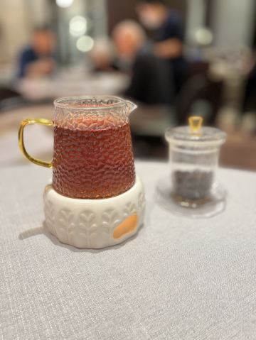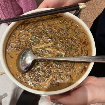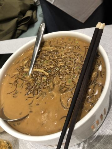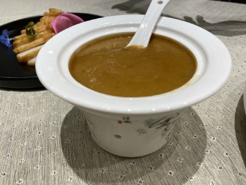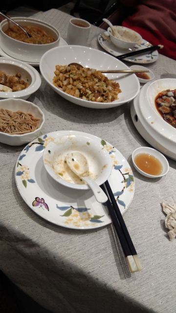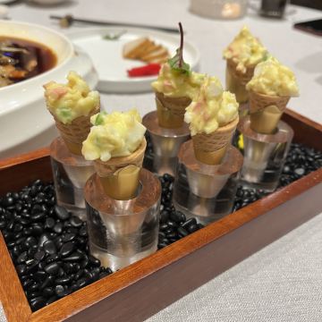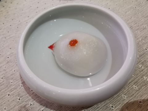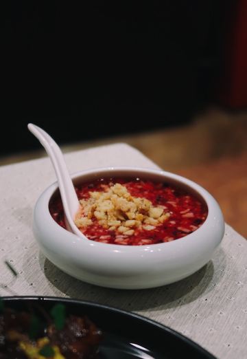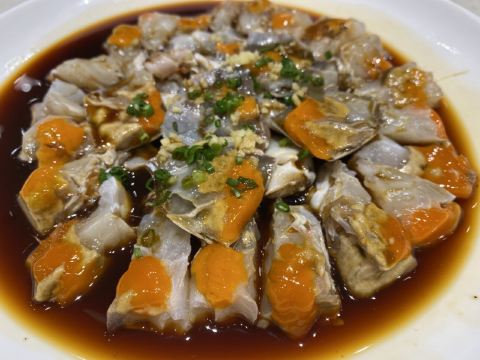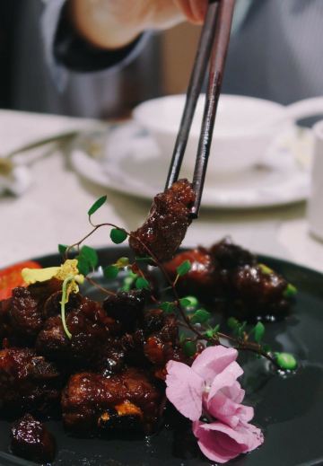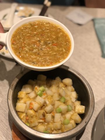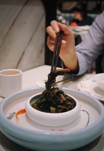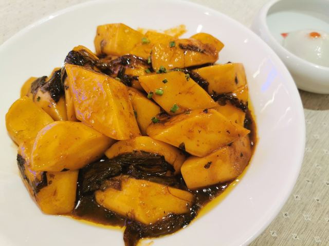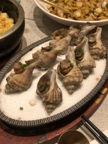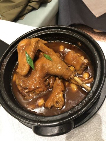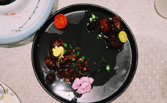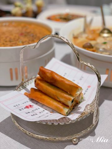 轻轻的一个蚊▫️白蟹酱炒年糕|这道菜里的两样食材刚好是我和我妈的最爱。我妈我负责解决蟹肉 我承包年糕 块状年糕软糯弹牙 蟹肉也很鲜。 ▫️芋艿羹|这个太喜欢了!咸口的芋泥是熟悉的家乡味。保留一些颗粒感的芋泥融合了猪油葱香 真的一口一口停不下来 ▫️烤菜心|弥补我上次去宁波没吃到的遗憾了 小小一碗浓油赤酱的烤菜冷盘 看着平平无奇 但因为游动的金鱼的点缀 格调一下就上来了。 ▫️黑松露素鸭 ▫️话梅仔排|这两道摆盘依然是好看的 只是因此期待被提起来之后 味道表现略逊色了。 ▫️酒酿核桃|基本上每次吃江浙菜都会点的。颜值完全戳中我了 酒酿小圆子的基础上加入了核桃碎、红曲米 呈现出漂亮的蔓越莓红色。即使吃到最后了也还是食欲大开。 ▫️手工宁波汤圆|一颗大汤圆足矣。皮子很薄且糯 象牙色透着内馅 咬开是流油的黑洋酥。