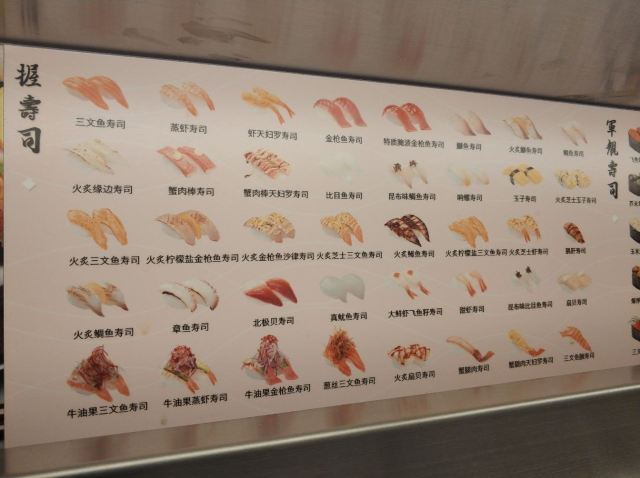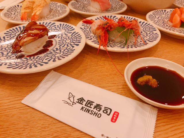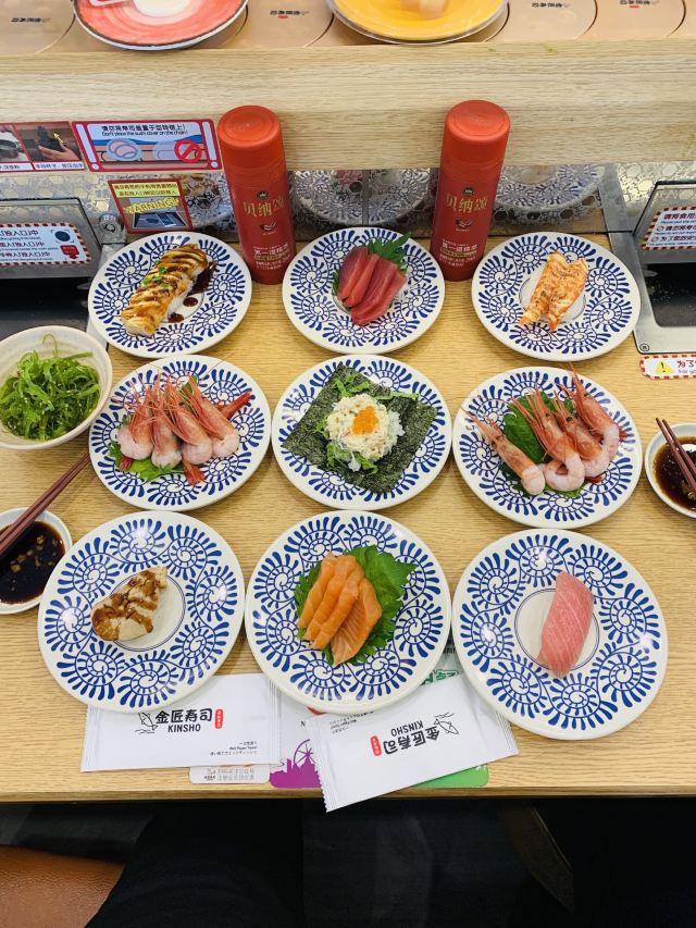 KINSHO SUSHI来过挺多次的 感觉比争鲜种类太多很多!价格么10元-15元不等 刺身20元一盘(4片),还算性价比很高的!全程都是自助式点餐 感觉还是很不错的 当场点单 然后有一个小赛车会开到你面前 还是挺有意思的!吃完以后 盘子从指定的端口扔下去!超现代!