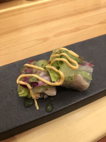 入住酒店,偶尔间发现的店:竹善日本料理。 没有想到阿纳迪酒店的二楼里竟有一家日料店! 店内日式装修,原木色系,清新素雅,榻榻米很舒服, 店员服务周到贴心,主动问候,添水及时,提供热毛巾! 坐在吧台就餐可以看到大厨出神入化的的操作! 竹善日本料理的资深大厨刘恩成,获奖无数! 特别限定的料理,单人餐,168的性价比真心超高! 蔬菜春卷,摆盘精美,艺术感强,酱汁酸甜开胃! 松茸海鲜汤,鲜美无比,甜虾刺身拼盘新鲜肥美,三文鱼厚切。 海老天妇罗,控油非常好,天妇罗薄衣很脆,鳗鱼柳川锅,鳗鱼吸收浓郁的汤汁,入味。 竹善创意寿司拼盘,米用的很好;自制的提拉米苏很好吃!