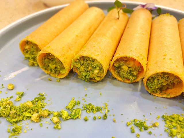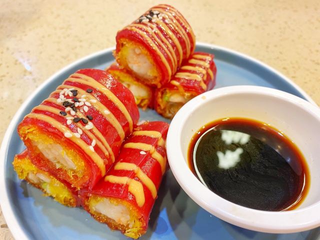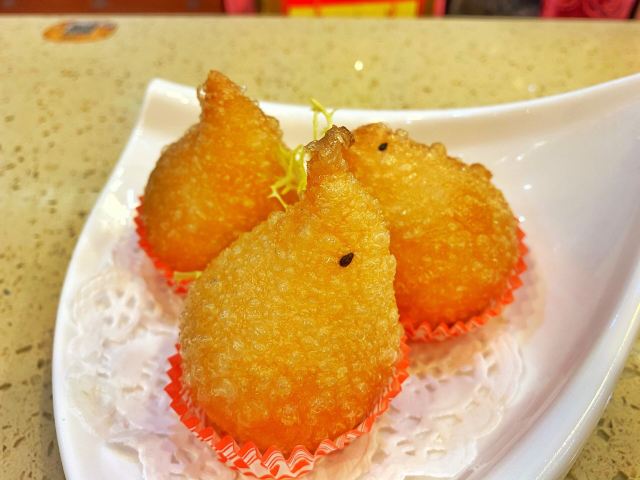 Monimika☘️心心念念的点都德,终于吃到了。 ☘️「金莎海虾红米肠」:点评上看到这个是推荐菜,于是果断下了单。外层的红米肠有点像雪媚娘的口感,里面的虾肉和虾饺皇一模一样,好吃。 ☘️「西杏片炸鲜奶」:杏仁片很香脆,炸鲜奶外脆里嫩,味道不错。 ☘️「叉烧酥」:叉烧酥面粉裹得有点多,叉烧比较少,偏甜,感觉一般。 ☘️「干炒牛河」:意料之中的美味,绝对管饱。 ☘️「真係菠萝包」:说实话,有点失望,菠萝包的皮怎么会这么厚、这么干,完全不像港式茶餐厅的菠萝包,不太喜欢。 ☘️「金牌虾饺皇」:超级好吃,虾肉里面还混了芹菜,鲜美无比。 ☘️「香芋西米露」:非常奇怪的口味,喝了一半就放弃了。 ☘️店家贴心的准备了口罩收纳袋,细节到位。