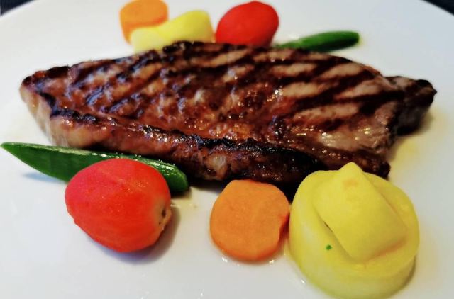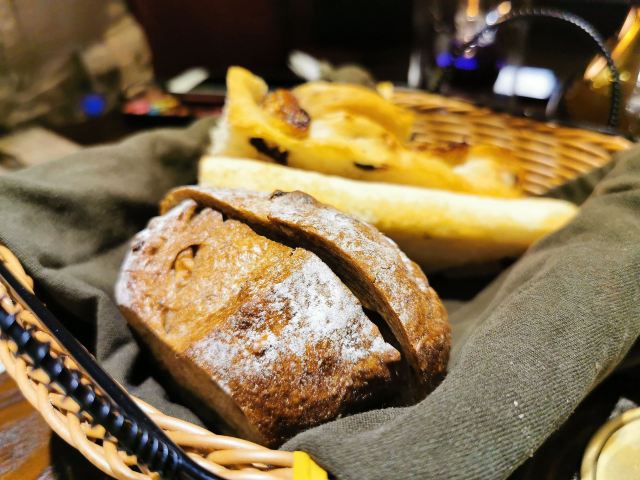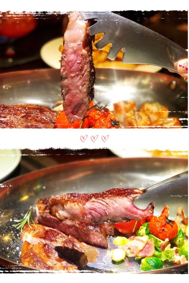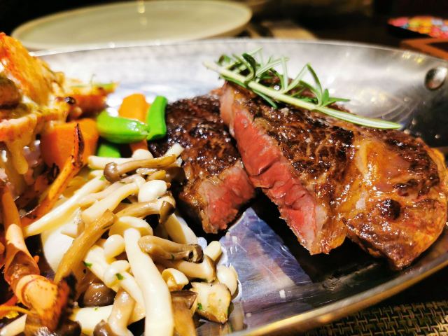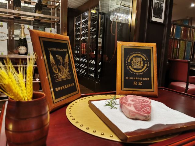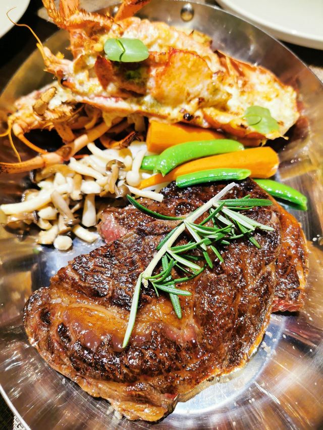 YMYK[薄荷]环境: 老牌海伦宾馆的楼上,交通方便就在步行街上。环境就是很经典牛排西餐馆的style,门口有aging room,人多的话倒是可以来份战斧。 [服务铃]服务: 不时会来询问口感,表现挺专业。 |餐前面包^ 免费餐前面包,一款无花果蔓越莓的面包🍞很好吃,蘸点黄油[调皮] |凯撒沙拉^ 很经典的一款,生菜和脆面包还有特别的酱汁,很清口。 |上牛排前选刀^ 吃牛排可以选刀,选了法国牛排刀挺利索。 牛排是金凤凰,m6-7等级的肉眼,要了五分熟的,油脂分布均匀,很juicy。另外加了龙虾 ,芝士焗的,肉质很鲜弹。 很专业的一家牛排馆,下次生日可以考虑弄个战斧吃吃[调皮]