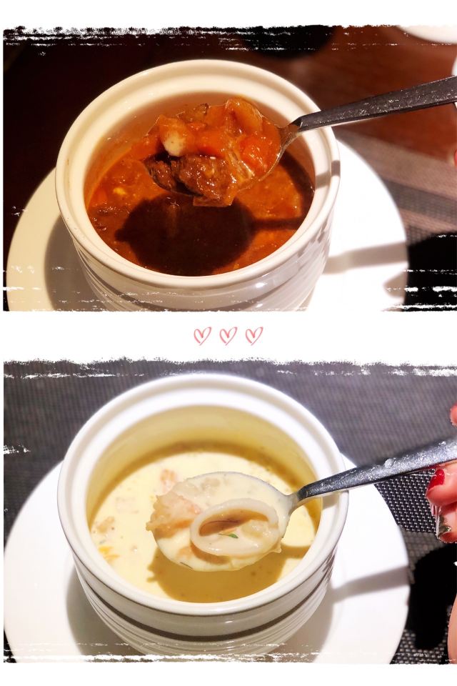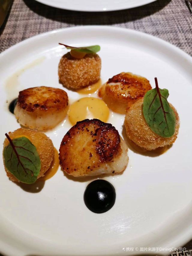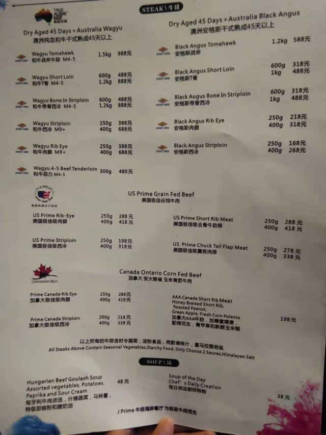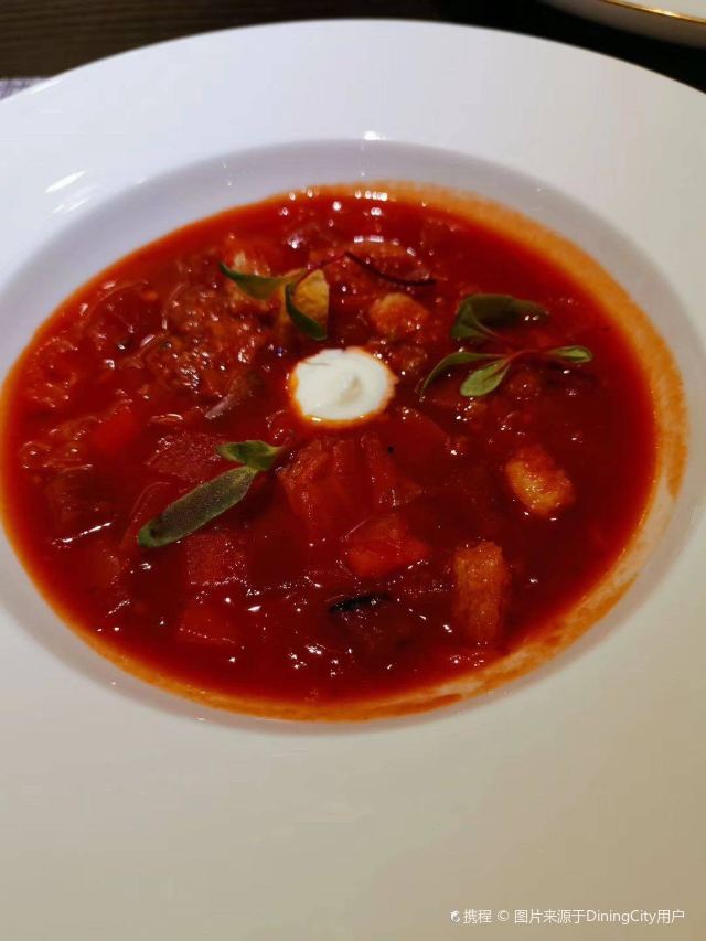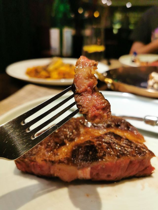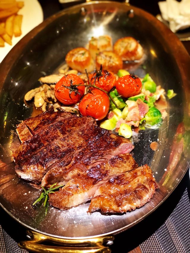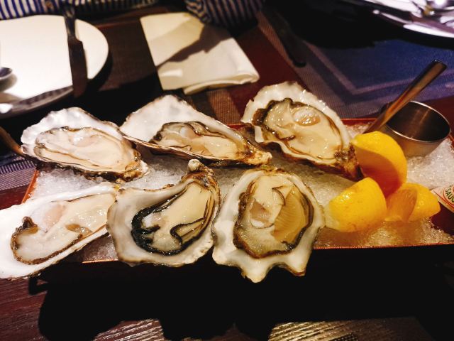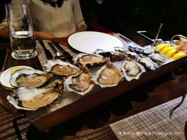 蛋花食游记步入餐厅,新年气氛装点浓郁,整体欧美复古装修风格,典雅高贵,皮质沙发舒适高档。餐厅还非常浪漫地布置了星空顶,星星点点下的烛光晚餐,浪漫纷繁。 翻菜单先选牛排,餐厅很贴心地把菜单分成单人份和双人及多人分享份的价格。点了M8-9级别的肉眼,688元400克,价格非常地良心。听说老板是有名的牛排贸易商,所以从牧场到餐桌,享有直供渠道,性价比也非常地高,相当于其他餐厅同等价格的5-6折。上餐的步骤和顶级牛排馆一样,服务员会把要烤制的生和牛牛排给你看一下,来自于2019年世界牛排挑战赛冠军的金凤凰纯种和牛, 雪花般的纹路令人心动,透漏着别样的细腻。我们按照个人的喜好点了7分熟。烤制后的牛排色泽金黄, 牛肉的香味弥漫在空中,旁边配的澳带色泽晶莹洁白,玉珠般的点缀在餐盘周围,秀色可餐。尝了一口,牛排表层焦香酥脆,里面鲜嫩中带着一丝韧劲,汁水随着咀嚼不断爆出,牛肉特有的油脂味醇香浑厚,绵绵悠长,在唇齿间化为甘甜,幸福感瞬间爆棚,天下美味不过如此。 点牛排可以特惠加配餐,点了香煎北海道带子,跟 牛排一同上桌,带子的直径非常大,新鲜圆润,用黄油煎烤,入口软嫩多汁,细腻润滑,鲜而不俗。这一丝小清新不但综合了油脂的油腻,更加丰富了口味的层次感,堪称点睛之笔。 餐厅的生蚝是208半打,入口处就有展示,会上三个品种。其被称为水中贵族,又以法国和新西兰的为佳。店家准备的正是两款法国和一款新西兰的生蚝。肉质白嫩,晶莹剔透,奶糖一样的丝滑,光看就能勾起食欲。吃生蚝无需繁琐的料理技艺,几滴柠檬汁即可。一口下去,滑嫩的口感像豆腐一样,又带着一丝嚼劲,回味带着甘甜。肉质中的一缕鲜咸鲜是大海的滋味,咀嚼之间仿佛海洋一下子涌入了你的味蕾,为你打开一片新的天地,最后连壳里的汁水都忍不住全喝下去,也只有顶级的生蚝才能把美味发挥的如此淋漓尽致。另外生蚝也分雌雄的,雄性的生蚝口感脆爽,雌性的则肉质软嫩,有兴趣的朋友可以体会一下。 汤品中竟然有匈牙利牛肉汤之选,十几年前西餐刚刚在上海盛行的时候曾经风靡一时,之后渐渐地被奶油蘑菇汤和南瓜汤所代替,消失在时代的长河中。没想到这里还能品尝到老牌的匈牙利特色。汤头色泽红润,有点罗宋汤的感觉,尝了一口,汤汁香浓入味,牛肉酥烂,微微的酸辣味更能开启味蕾,暖心又暖胃。 给我们服务的是外国小哥哥,夹杂着带点口音的英文,但菜品介绍得很详细,也基本听懂了,总体很贴心。