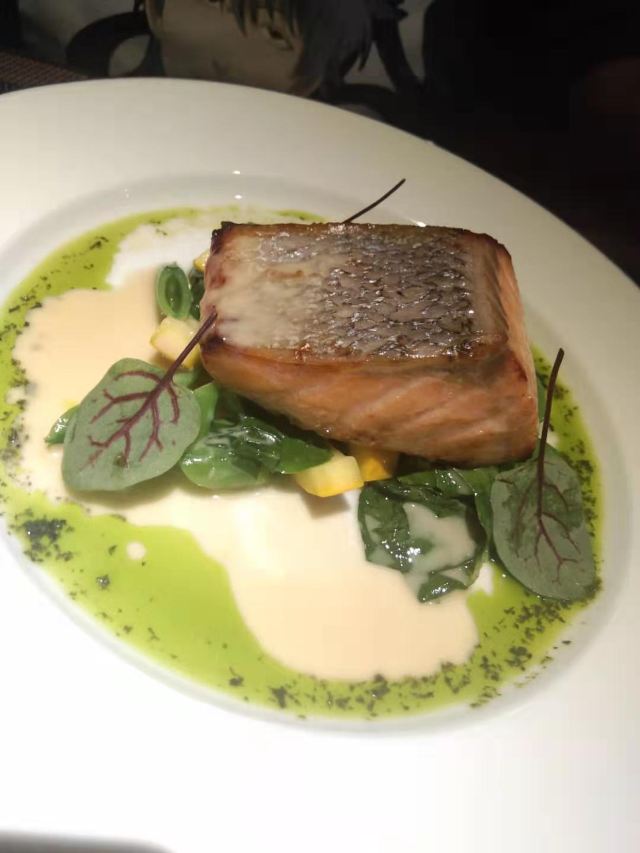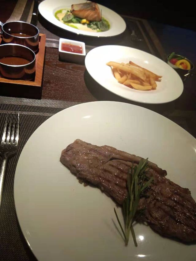 狸狸喵喵周末约上好姐妹去小情调一下。环境不错,外圈的卡座和内圈之间还有彩色玻璃屏风做了隔断,加强了私密性。不过可能是排风问题,餐厅进门玄关处的油烟味比较重,不过到餐厅这边就没啥味道了,可是刚进门的确有些呼吸不顺畅。 南瓜汤的稠度和奶油配比都控制的很到位,没有那种腻歪感。 前菜选的西瓜沙拉和三文鱼,摆盘讲究,口味上不功不过。 沙朗牛排,选了一个三分,一个五分,一个七分。不过从牛排横截面看,肉眼直观生熟度差不多哎。好在味道大家都还满意。 甜品奶酪满好吃的,QQ的挺讨喜。 生蚝很赞,回味甘甜,连平时不怎么吃生食的盆友也在尝过之后,忍不住又多吃了一个。 服务是个亮点,我觉着比诸多收服务费的餐厅做得都还要好,工作人员很热情,撤盘换餐具也及时。看到我和盆友们自拍合照,服务员马上主动来帮我们拍。