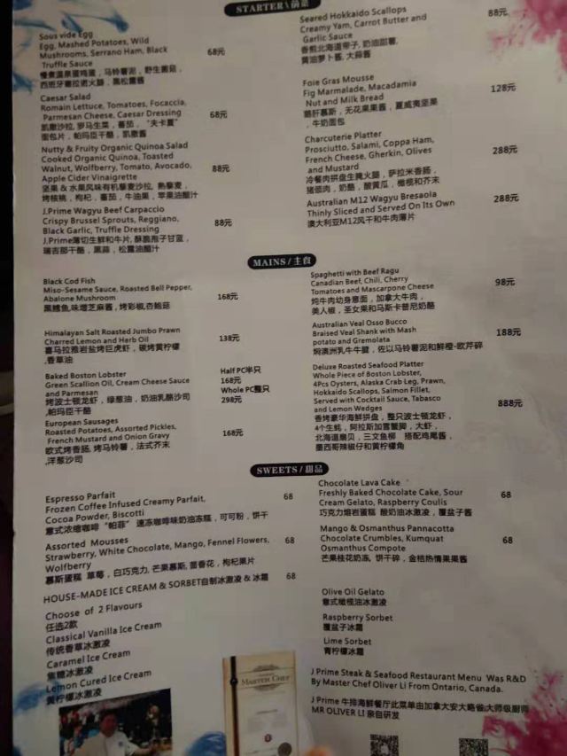 J Prime开在海伦宾馆里的牛排馆,装修很怀旧风。餐前面包很好吃,龙虾汤很够味。这肉据说是得过奖的,口感真是不错,个人认为比江边那几个有名的店还好一点。主菜的装盘也挺有意思,都一大盘一大盘。只是英语都还给老师了,点单只能靠手语,店家是不是多找几个国人服务员呐。关键是这家还不收服务费。