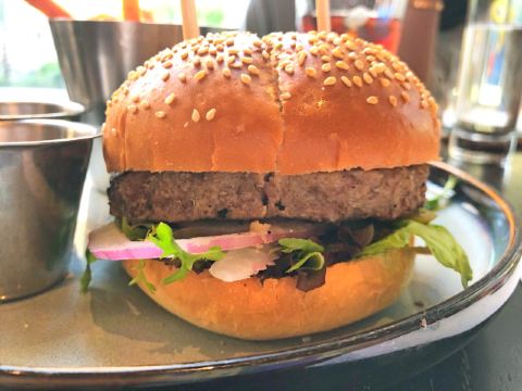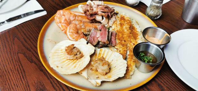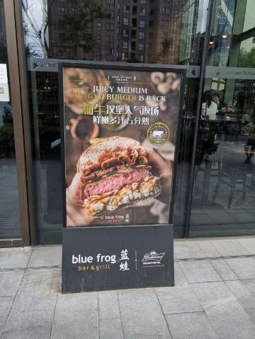 泡泡龙他爸好多年前去的蓝蛙,去年先到了徐家汇永新坊地下一层的蓝蛙,感觉比以前好多了,菜品丰富;然后就遇上机会,去了凯德晶萃的这家分店。凯德晶萃的地皮,上个世纪是针织九厂,家里长辈曾经在那儿工作过一段时间,读书的时候我也曾经进去过,十来年前变成了进世博会的地铁安检入口,现在变成了商场。蓝蛙在靠徐家汇路马路一侧,正对着马路南侧的汇龙新城,乘车沿徐家汇路走就会第一时间看见蓝蛙。去年八月找了个时间带上长辈一起去探路,坐在室内,空间分隔成几个相对独立的单元,层高很高,视野开阔,可选择余地极大,小家伙要了蒙大拿风味烧烤牛肉汉堡,大家一起拿了个碳烤海鲜拼盘分享,做的很不错,虽然价格也不便宜。注意一下,要从商场外才能进蓝蛙,商场内部没有入口