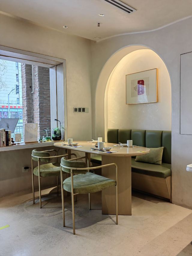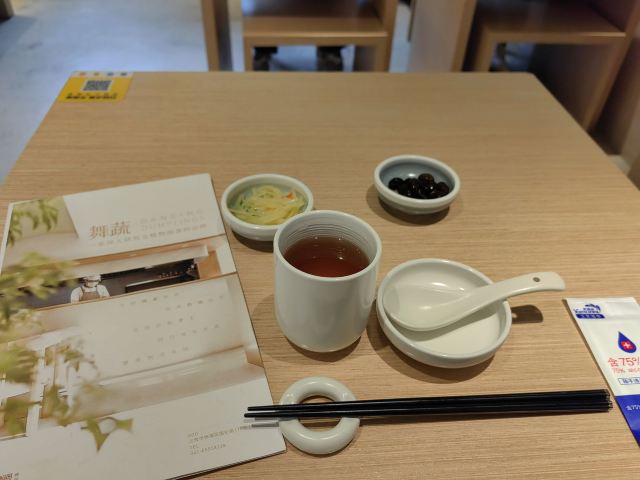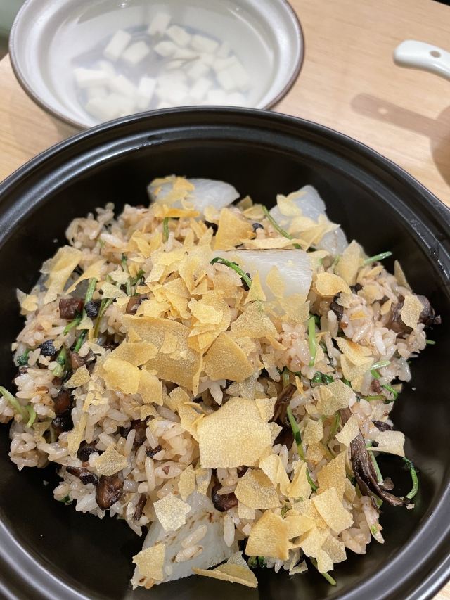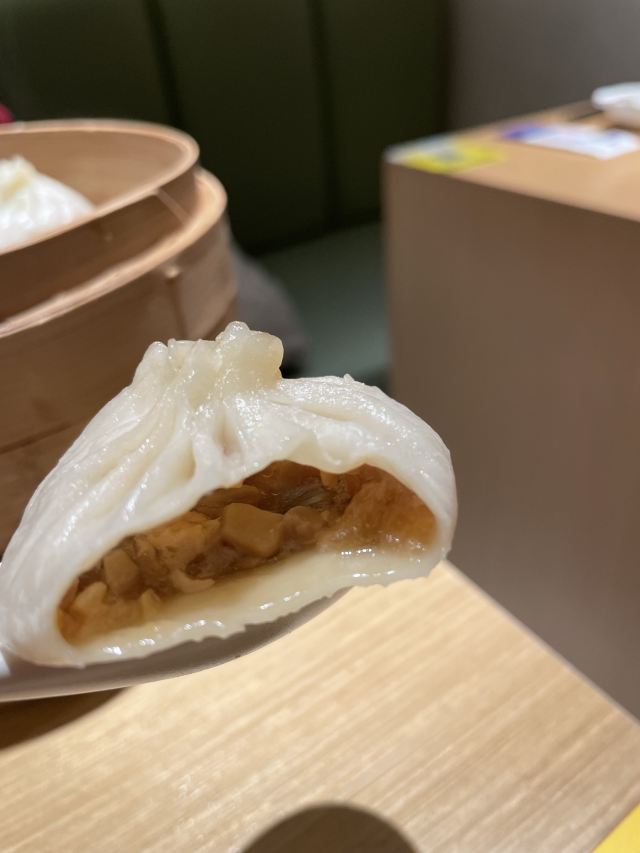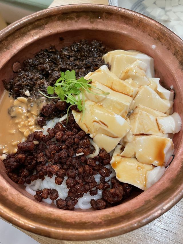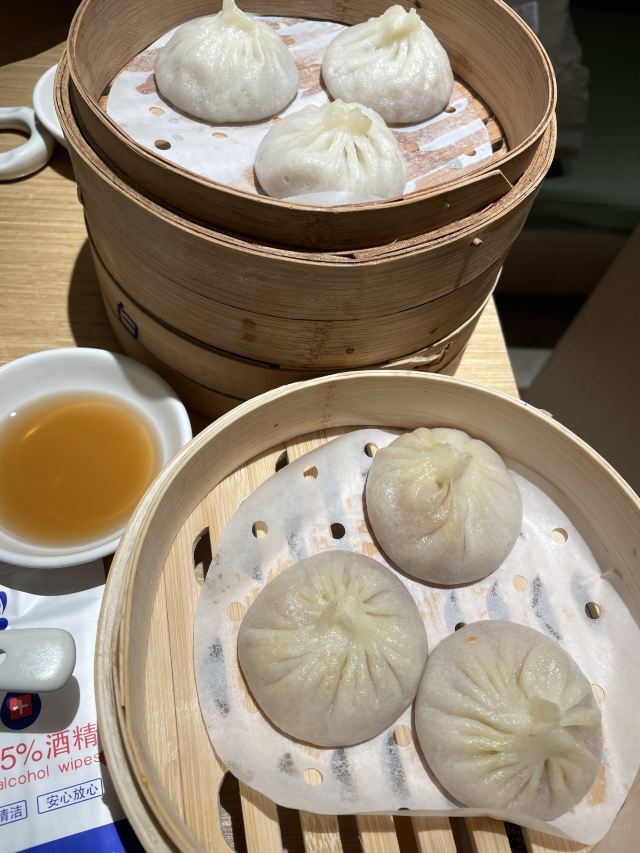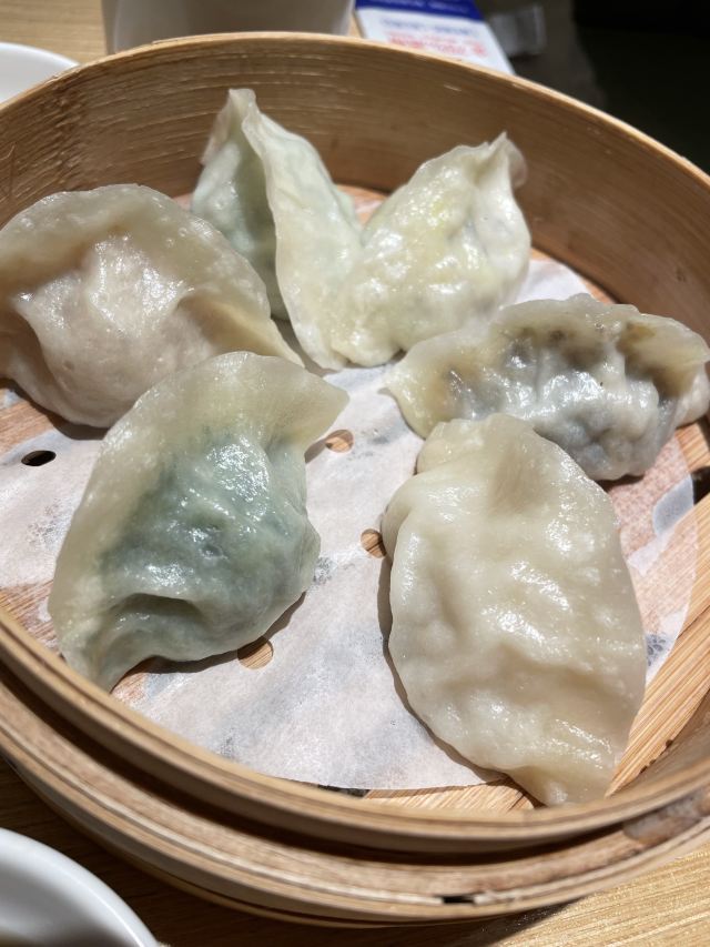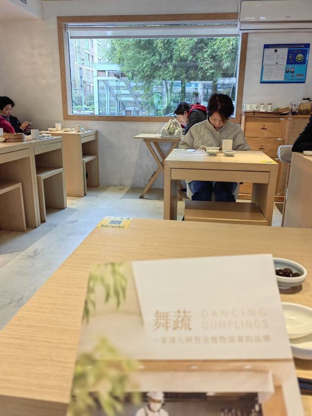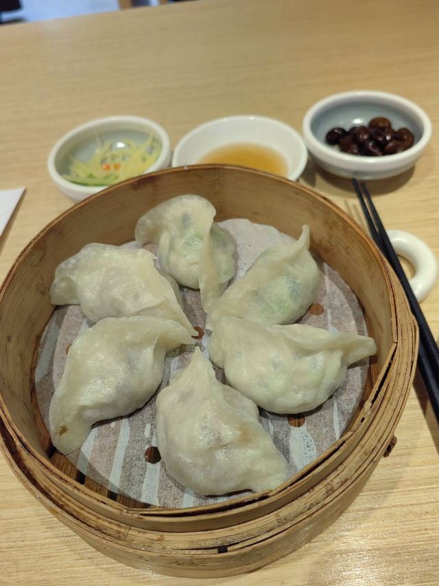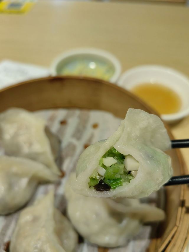 舞蔬尚饺(国安路店) 来吃素,停车停对面商场里。 这次来竟然不用等位了。 茨菇萝卜焖饭 42元,萝卜块等等,家人喜欢,配的莼菜豆腐汤不喜欢。 双拼小笼 33元6个 招牌灌汤小笼包 素蟹粉汤包 小笼皮薄的 全家福煮饺 23元全家福蒸饺,有荠菜、芹菜、白菜、萝卜丝、地皮菜等。 云南豆花米线 28元,可以选不辣的,米线偏软烂了点。 本来还想点提拉米苏,店员说要等解冻,太慢了作罢。下次来点点其他的~