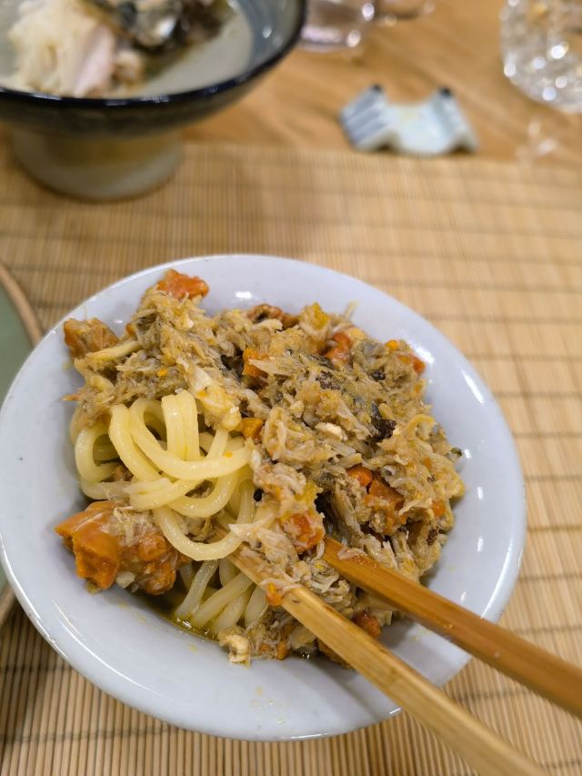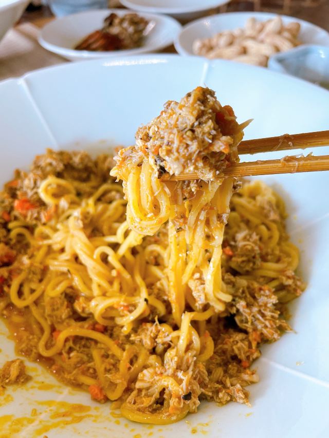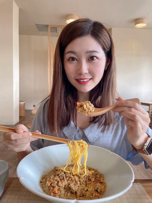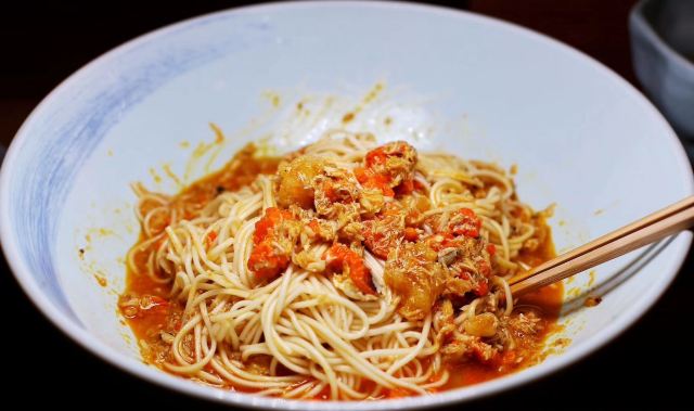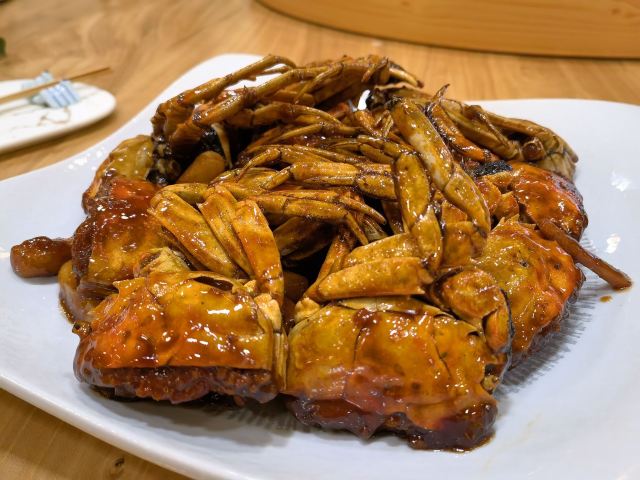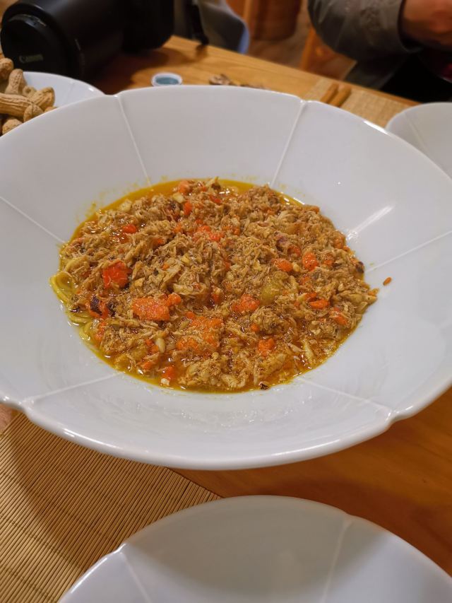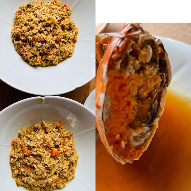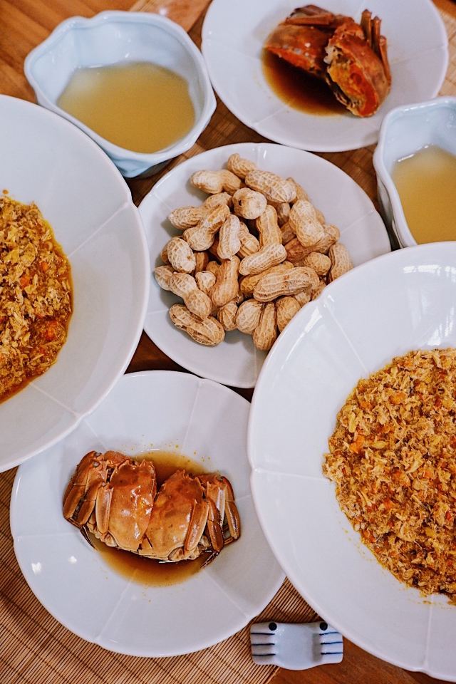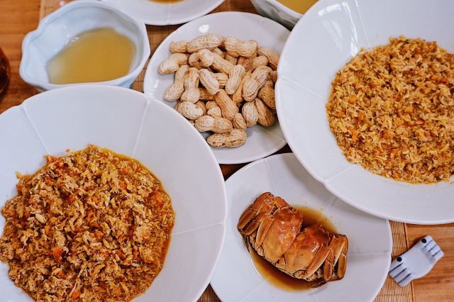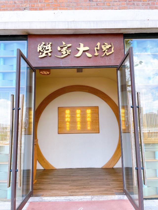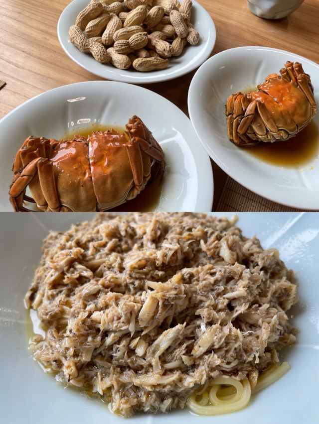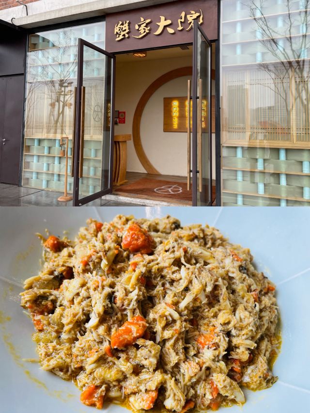 加油干饭呀从小到大被灌输的都是,书中自有黄金屋,书中自有颜如玉,但其实蟹中才有黄金屋,每一口都赛黄金。 不可思议‼️工作日中午竟然有这么多人来吃¥360一碗的蟹黄金,足以可见蟹家大院的魅力。入座后先嗑嗑花生喝喝姜茶,醉蟹的切面看起来就垂涎欲滴,红润丰腴的蟹黄是无可比拟的鲜香四溢。 吃蟹最大的快乐❓蟹黄金会告诉你❣️一整碗蟹黄面金黄灿灿量足味美,面条可以无限续加只要你吃得下。 店里气泡水和酸梅汤都是畅饮,门口如果有空位可以停车,高峰时期需要等位或拼桌。老板真的是豪气满满,店内特意开辟出一长排等位区,刮风下雨都不怕。 最后我建议你们吃饱喝足去一下洗手间,感受一下土豪金配帝王椅的霸气。