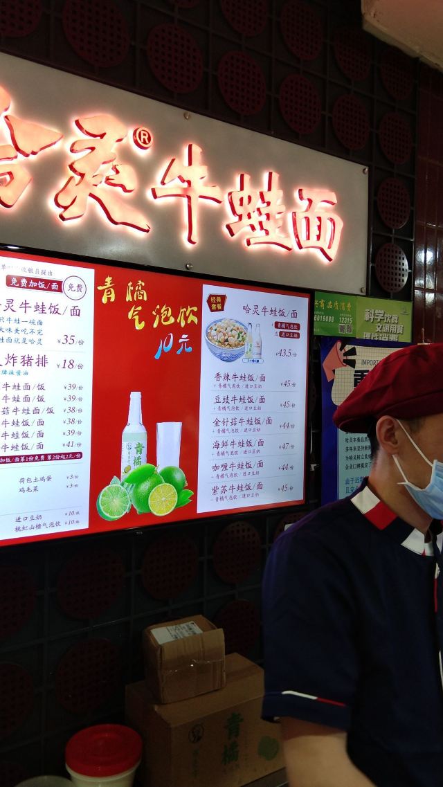 香辣牛蛙面,炸猪排,哈灵牛蛙饭,海鲜牛蛙面,海鲜牛蛙饭,鸡毛菜,山楂汁,素浇面,牛肉面,经典肉丝面,海藻丝,娃娃菜牛蛙饭,百事蓝可乐,酸辣牛蛙,山楂汽水,哈灵牛蛙面套餐,哈灵牛蛙面,老上海炸猪排,香辣牛蛙饭,进口豆奶,酸菜牛蛙饭,娃娃菜牛蛙面,望山楂气泡饮,酸菜牛蛙面,哈灵牛蛙饭套餐