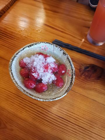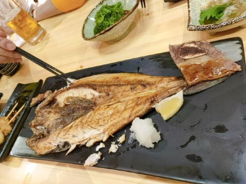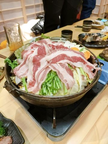 自由的花爱吃柚子金枪鱼沙拉^ 实足的金枪鱼肉,配以各类蔬菜,鱼肉汁把蔬菜浸润,整体口感非常好 |黄油土豆^ 香气四溢,黄油在焗烤后奶香味十足。 |寿喜锅^ 材料丰富且新鲜,有牛肉卷,内酯豆腐,魔芋丝,金针菇,一些熟菜。赞👍一下它家的汤底,比以前吃过的很多家更适口。没有过甜或者过咸。 |鸡肉丸子^ 快赶上大号乒乓球的大小,好像是鸡肉和脆骨一起做的馅料,并且炸过。太香了 |烤香菇^ 很喜欢它的配料蘸酱,有点像腐乳的味道。 |京葱鸡肉^ 似乎用的是上腿肉,肉质比常规的鸡肉更嫩。 以下是BONUS,来自店家的赠送: |青花鱼^ 份量很足,配了青橘和萝卜泥。一点点的酸味让鱼肉更嫩。 |辛烧肉^ 虽然有青椒红辣椒,但完全不辣。炒的牛肉卷很嫩。 |炸鸡块^ 配了个蔬菜和美乃滋。炸鸡本身就已经很香了,配上美乃滋,和风气质十足。 [薄荷]环境: 门面非常有特色,像极了在日剧中出现的居酒屋。