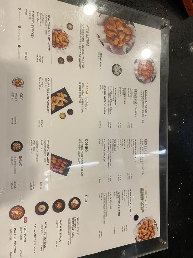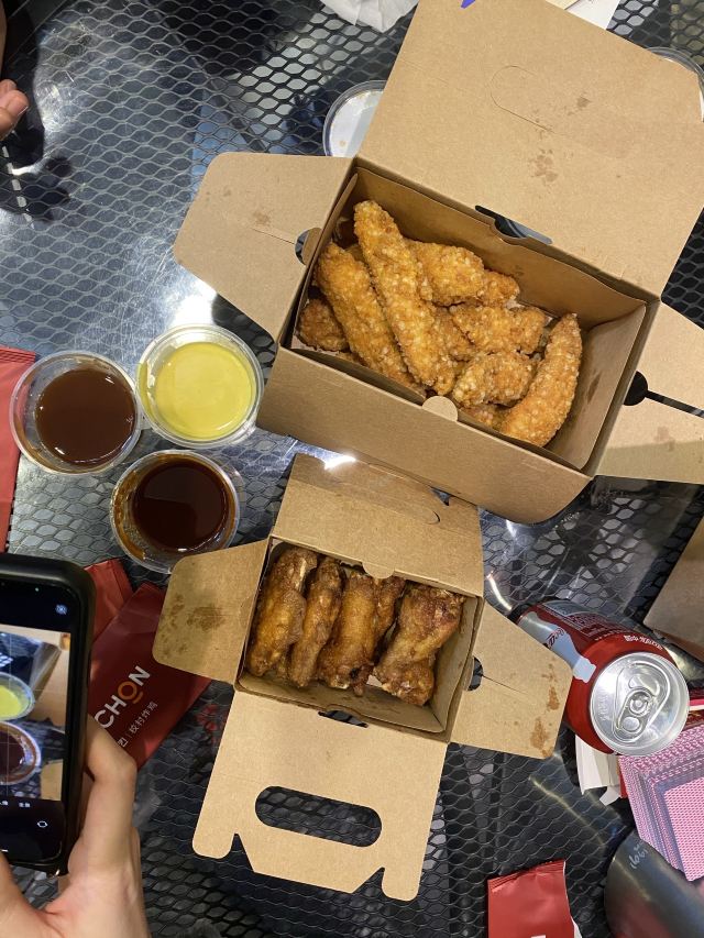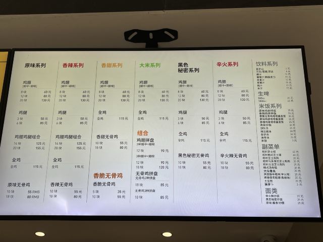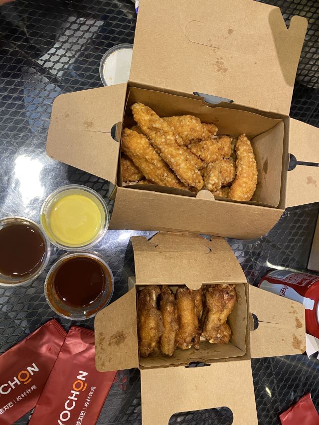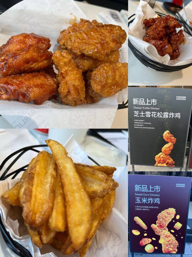 蜜汁鸡翅,香辣鸡翅,原味鸡翅,香辣鸡腿,大米鸡翅,酱香无骨鸡柳沙拉,大米全鸡,泡菜炒饭,辣味鸡翅,椰汁,苹果汁,葡萄汁,香甜鸡翅(8个),校村炸鸡,腌萝卜,香甜全鸡,鸡腿鸡翅组合,全鸡拼盘,薯条,可乐,原味炸鸡,甜味鸡翅
