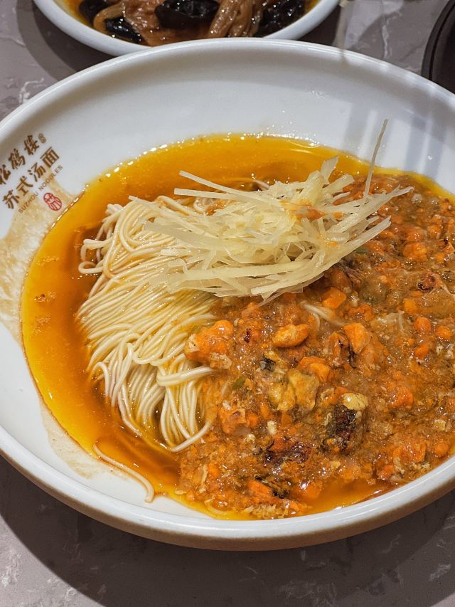 寂寞的西瓜想必碳水脑袋都是hin爱嗦面的吧,所以每次纠结不知道吃什么的时候,各种面条就成了首选。 除了常常打卡的本帮面或日式拉面,苏式面其实也很不戳,尤其老城厢里的这家老字号【松鹤楼面馆(豫园店)】,更是别有韵味。 👉 搭配满满一碗清炒蟹粉的这份【清炒蟹粉面】,鲜甜又浓醇,98r的价格已经非常超值,再叠加其他各种优惠,基本上80左右就能吃到啦,拥有蟹粉自由就是这么高性价比! 👉 一直对各种肉丝无感,但是Ta家的【扁尖肉丝】,真的每次都忍不住要加上一碟,也行就是因为有了咸鲜的扁尖加持,肉丝的味道才变得好吃了吧~ 👉 开在【上海城隍庙】里的这家松鹤楼,比其他门店更有古典气质,爱!