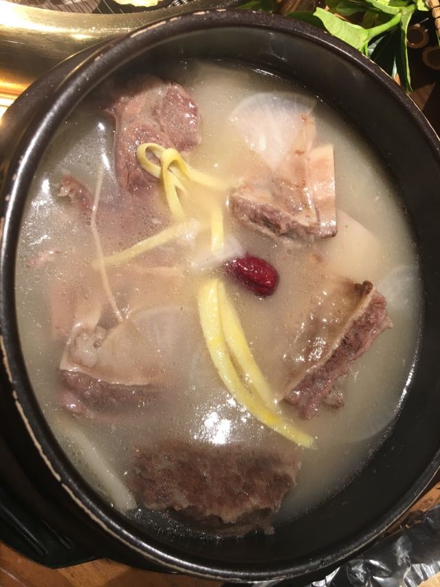 Huo lu Jia Hei Niu Dian (Tianle Square)火炉家黑牛店 隐藏在一众大排档似的饮食店之中 用餐区在二楼 没想到别有洞天 整体装修是木质格栅区隔 地面干净空气良好似乎不像传统烤肉店 如此偏僻小店五点半拿号前面竟然有十二桌 入座后金光闪闪的韩料餐具很是干净 让人用餐心情大好 有服务员专门前来全程帮助烧烤 八阶高升黑牛组合 最近比较流行的阶梯式烤肉 牛肉还真是蛮不错 有点不像这个人均的肉品 下次若是再来会尝试十五阶梯 特级雪花肋排 还是比较喜欢这种实实在在的大块肉 肉嫩肥瘦相间 适合大快朵颐 深海红魔虾 蛮大的两只虾 已经开背洗净 配芥末可以当刺身 也可以烧烤食用 铁板鱿鱼 鱿鱼占比很多很实在 看似很辣但仅仅是一点点微辣 牛排汤 牛骨带肉 没有一点肥肉 骨肉根根清晰 就算冷却后 肉汤也没有凝结白色油脂状 很是受欢迎 锡纸金针菇 酸酸甜甜的开胃极好 双人食吃得饱饱的 性价比很不错的店 推荐