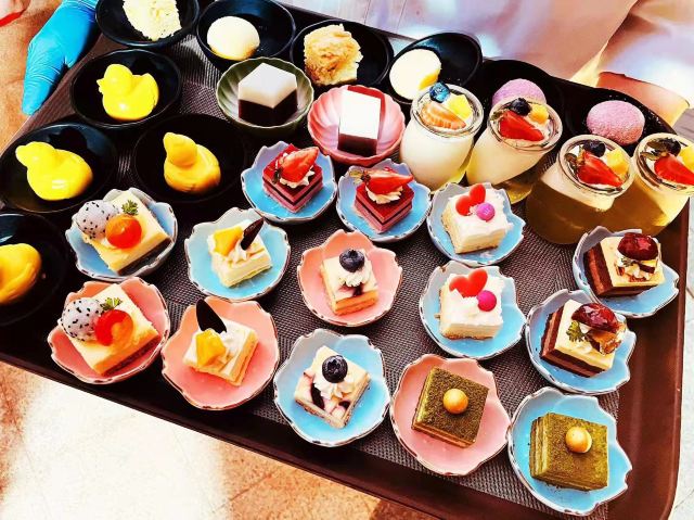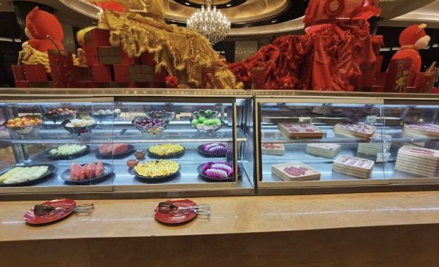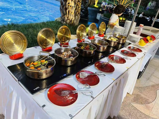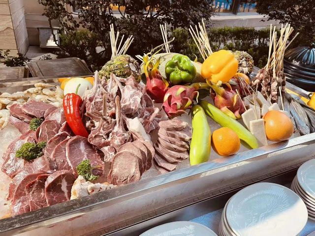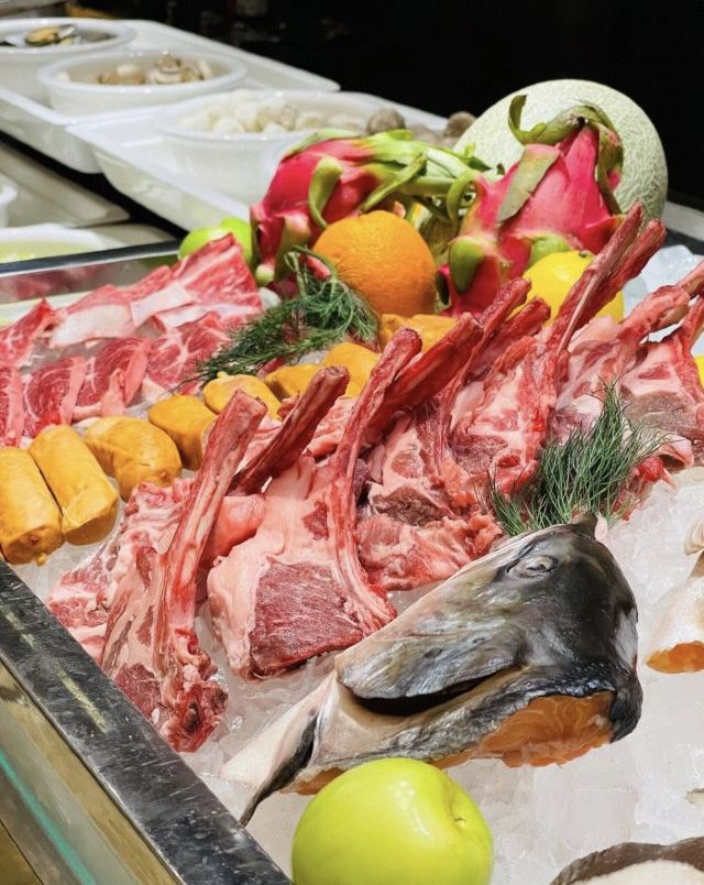 新西兰牛仔骨,扒银鳕鱼,海鲜,扒大连十头鲍鱼,蒜蓉粉丝蒸扇贝,香辣龙虾,蟹脚,黑金炖猪展肉,桂花银芽炒瑶柱,大虾,牛排,巧克力瀑布,芝士局澳龙,哈根达斯,羊排,三文鱼,蒜泥小青龙,砂锅海鲜米粉,芝士蛋糕,果木烤鸭,铁板黑椒牛仔骨,佛跳墙,老火靓汤