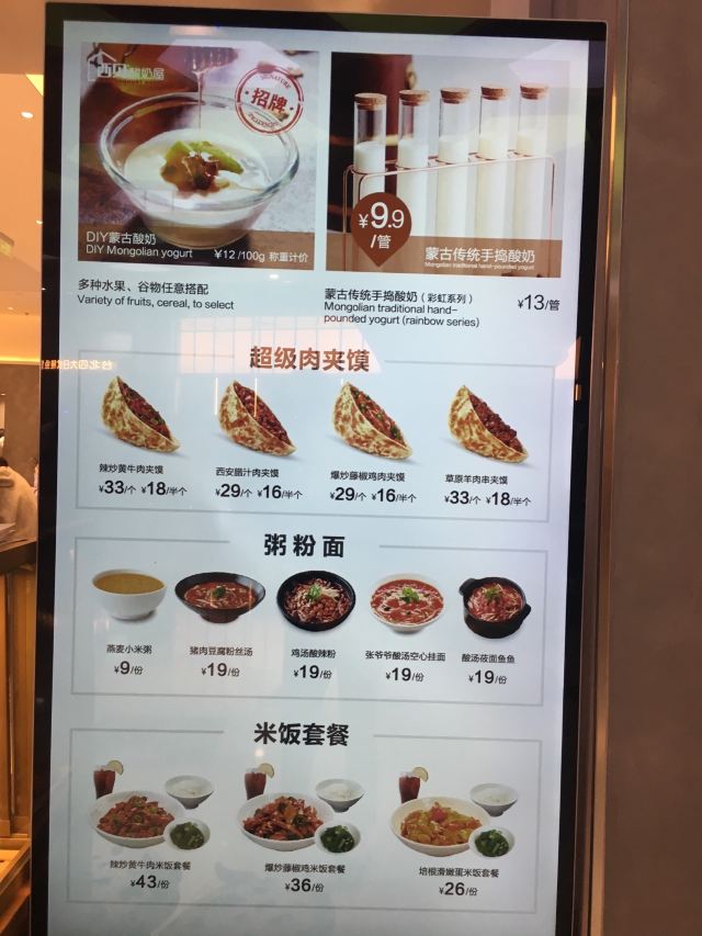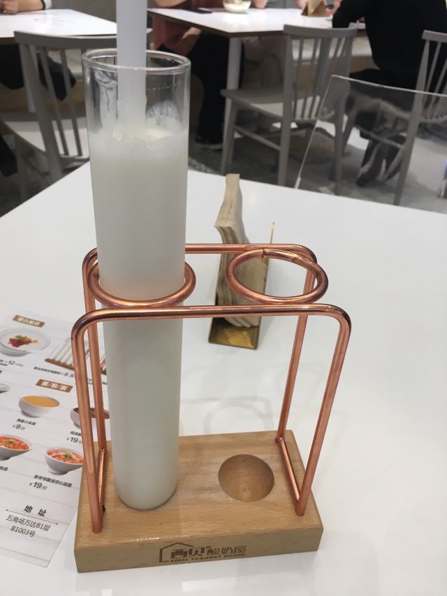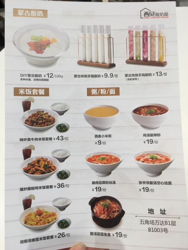 店里座位宽敞,灯光明亮,昨天出门就带了个手机和钥匙,后悔没有带我的毕奇出来摆拍。 服务态度不错,一推开店门就看到一个店员妹子跪在地上擦地板,实在是太拼啦! 既然是酸奶屋,还是来喝喝酸奶吧,味道还是很不错滴~ 「西北酸奶」自己盛酸奶,自己加喜欢的水果和坚果,然后称重。价格不便宜,这样一份要40多,不过酸奶很醇厚,酸甜度刚刚好。 「蒙古传统手捣酸奶」选择了火龙果口味,比起diy的酸奶,这款稀薄一些。颜值很高,吸起来很爽,火龙果的怪味没有那么重,居然挺解渴的。 还挺值得二刷的,看到隔壁桌的美食我都快流口水了……下次来尝试店里的别的菜品哈~