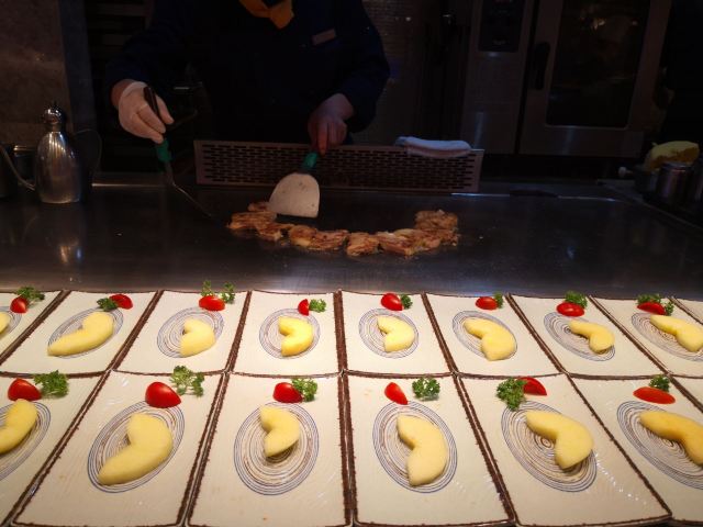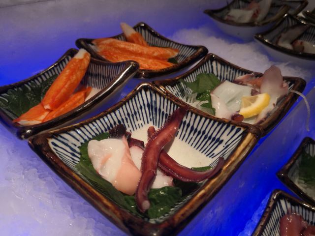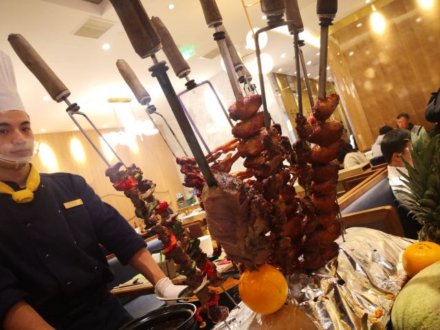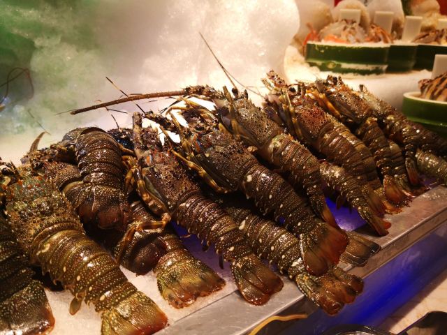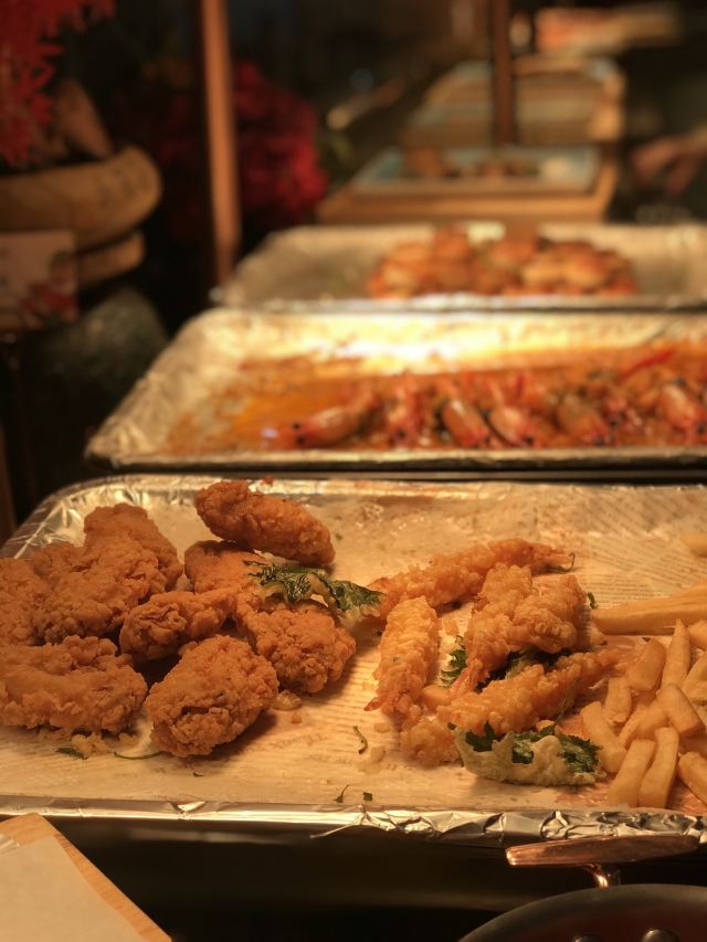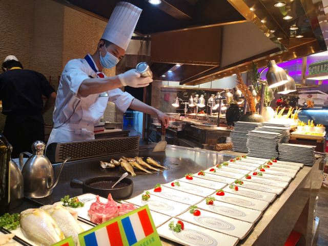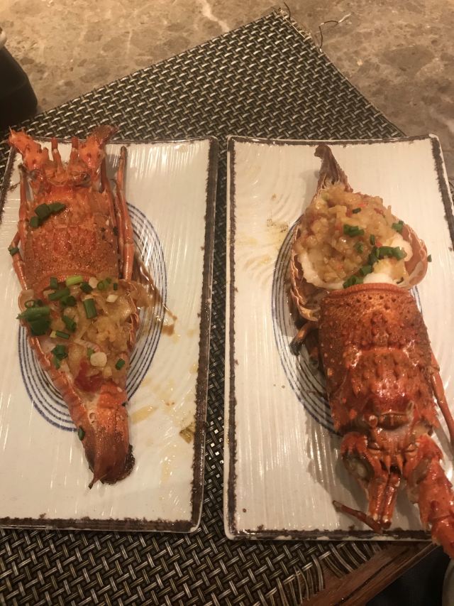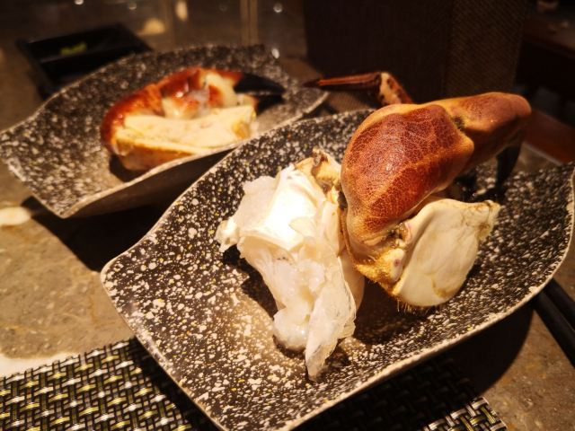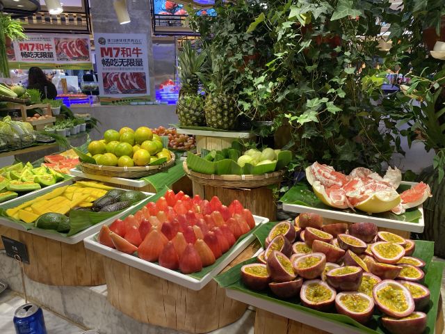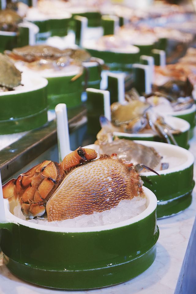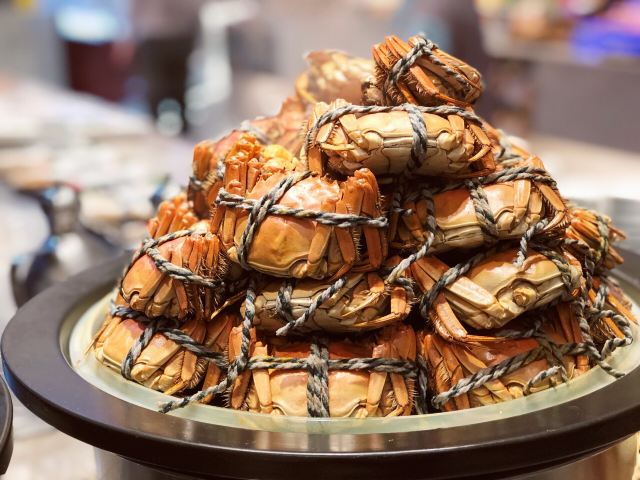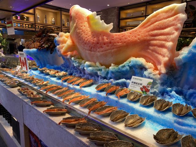 ma****ly餐厅进门正对着的就是各种海鲜区域,寻到位置之后就先去拿了一圈。 各种海鲜吃下来,发现用来涮火锅的话,竟然是面包蟹最好吃。 看看觉得好像餐食摆放区域不是很大,但食物种类真的很多,一顿吃下了,嘴没停过,但感觉自己只吃了一半不到的食物。 烤物里,鹅肝真心好吃,如果不是怕各种高,我可能不止只吃两块;羊排和牛排比较容易饱腹,还有很多烧烤的食物,除了自己去取,店员还会推出小车送到每张桌子边。 据说海胆是稀缺品,也不确定是不是午市没有的,反正我去了几次都没有看到过。 清蒸的蟹有大闸蟹和梭子蟹,两种口味不同,但口感都不错,都能吃出淡淡的清甜味道。 全程很多食材我都只吃了一次,只有烤榴莲吃了不止五六次,结束的时候,虽然已经觉得很撑,还忍不住又去拿了一碟。