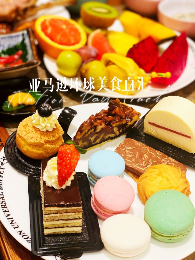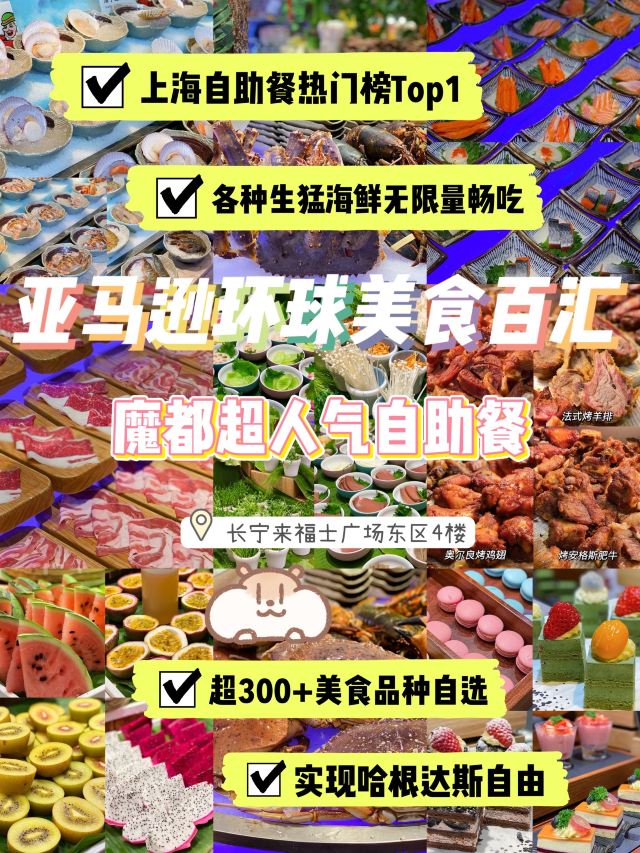 Sasa0828魔都自助餐Top1👑全场300+菜品无限量畅吃‼️ 不知道想吃啥的时候 自助餐基本就是我的首选啦 这家自助餐是我吃到现在品种最多的啦 怪不得在上海自助餐界里名气如此之大 ✅店名→ 亚马逊环球美食百汇 🔆坐标→ 长宁路1123号长宁来福士广场东区4楼 🚘交通→地铁2/3/4号线中山公园站出 ‼️工作日午市💰298/人 其余时段💰328/人‼️ 首先入座后先选锅底 锅底有三种选择 花胶鸡锅底/麻辣锅底/猪肚鸡锅 我们选的是花胶鸡锅和麻辣锅 花胶鸡锅底口感浓郁 越煮越浓稠 满满的胶原蛋白 麻辣锅还蛮不错的 不是特别的辣 涮肉涮海鲜巨好吃 🐠海鲜区 他们家的海鲜品种真是惊艳到我了 各种生猛海鲜应有尽有 而且全部都是无限量畅吃的 波士顿龙虾/帝王蟹/小青龙/大闸蟹/鲍鱼等等 只要你胃口大 只要你不浪费 随便你吃!!! 🍢烧烤区 羊肉串/烤羊排/烤鸡翅/烤榴莲/烤橙子/烤乳猪等等 每种口味我都拿了一点尝尝 味道还不错诶 肉肉很嫩 最爱的就是烤榴莲 连着吃了好几轮 太好吃了~ 🍣日料区 各种刺身/三文鱼/北极贝/寿司/甜虾等等 食材非常的新鲜 甜虾个头很大 三文鱼肉质厚实 寿司的种类也是非常多的 三个一吃居然有点饱了 🌈水果蔬菜区 橙子/香蕉/西瓜/木瓜/火龙果/百香果/奇异果等等 大概有不下20种水果吧 还有我最爱的车厘子 水果吃上去还都蛮甜蛮新鲜的 饭后来上一点是极好的 🍰甜品区 各种蛋糕点心品种也不少哦 Cheese Cake/马卡龙/抹茶慕斯蛋糕/布丁/奶冻等等 简直就是甜品控的天堂 一不小心热量又超标了