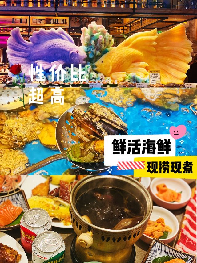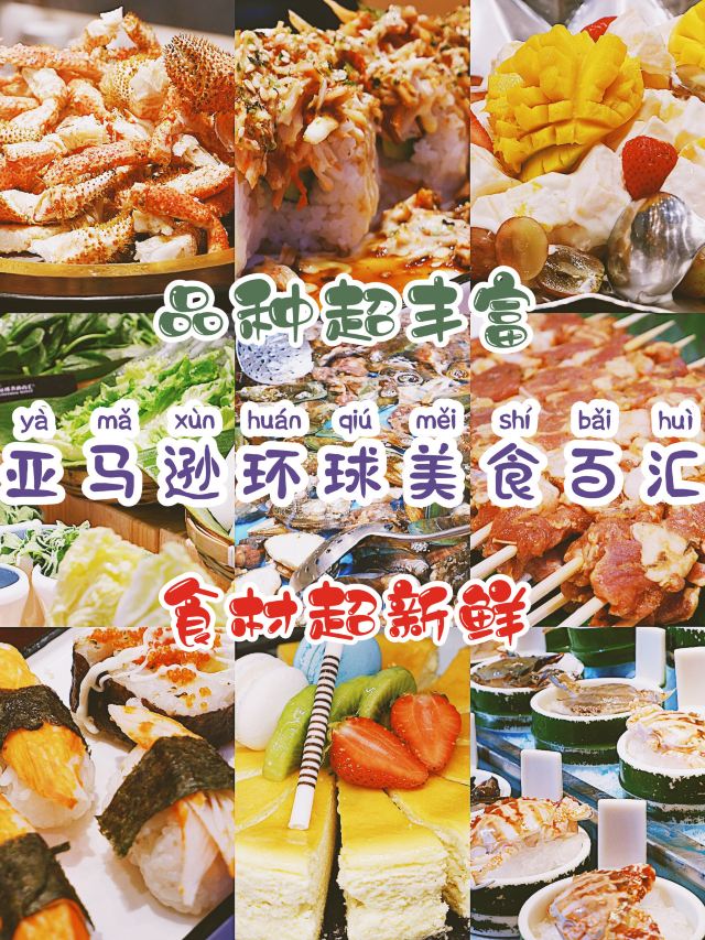 MomoHsuan🦞海鲜现捞现吃,全场400+道壕货,随便拿!亚马逊环球美食百汇里,牡丹虾、海胆、日料刺身全都有,鲍鱼、梭子蟹、活海鲜现捞现吃❗️性价比太高了吧~💓 [薄荷]环境:进门可见两尾漂亮的海鱼🐠,店面超大环境,装修很清爽!冷食、热食全部分开! [服务铃]服务:超级到位的服务,虽然是自助餐,但服务员也会将推车推到每桌,询问现烤的餐品要不要! 🍲菜品:简直太好吃了!!!各种菜品种类好多,还有新鲜水果!满足💯 「水果」超级新鲜!有菠萝蜜、柚子、橙子、山竹、火龙果样样都有哦!橙子之类的,都在剥开的,食用超方便[强] 「梭子蟹(活着)」一到秋天,就想吃蟹,她们家的蟹也太肥美了,公母都有,只只鲜甜 「M7和牛」火锅锅底种类也很多,还有各种牛肉!最赞的是他们家的M7和牛,肉质细嫩,入口即化!!想吃多少,都可以自取哦!商家太壕了🌹 「甜品拼盘」各种甜品应有尽有,最喜欢他们家的巧克力蛋糕🍫,口味浓郁香甜,用料实在,吃饱了还能来几口! 「清酒」饮料种类很多,现开椰子吃好吃,此外,连酒类都可以畅饮,真的是很实在🍶
