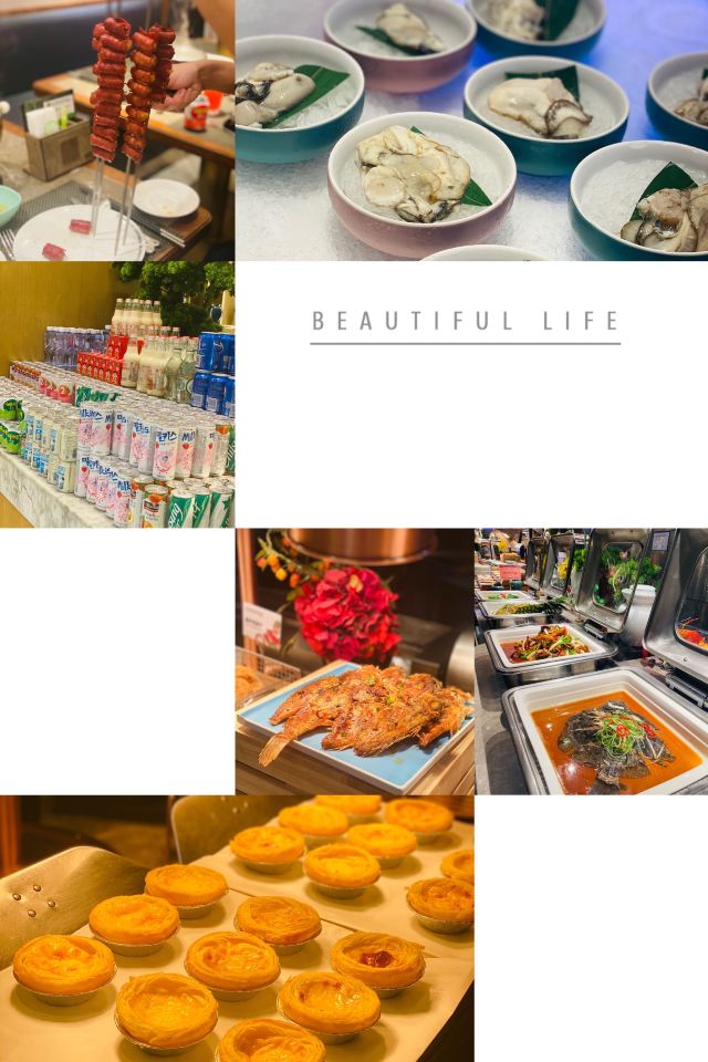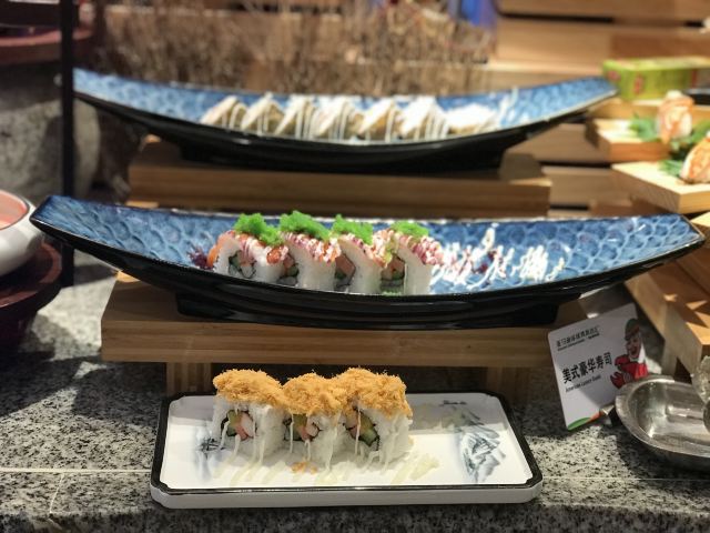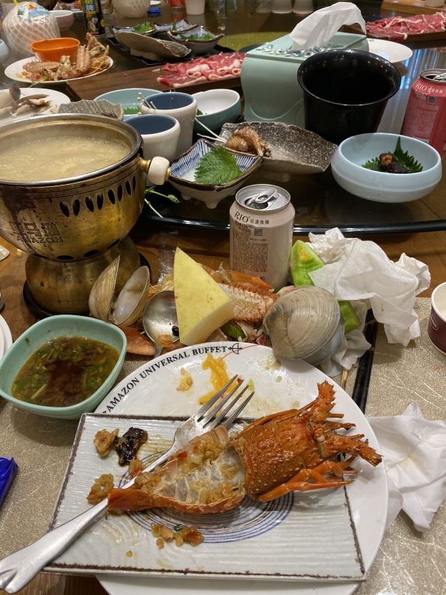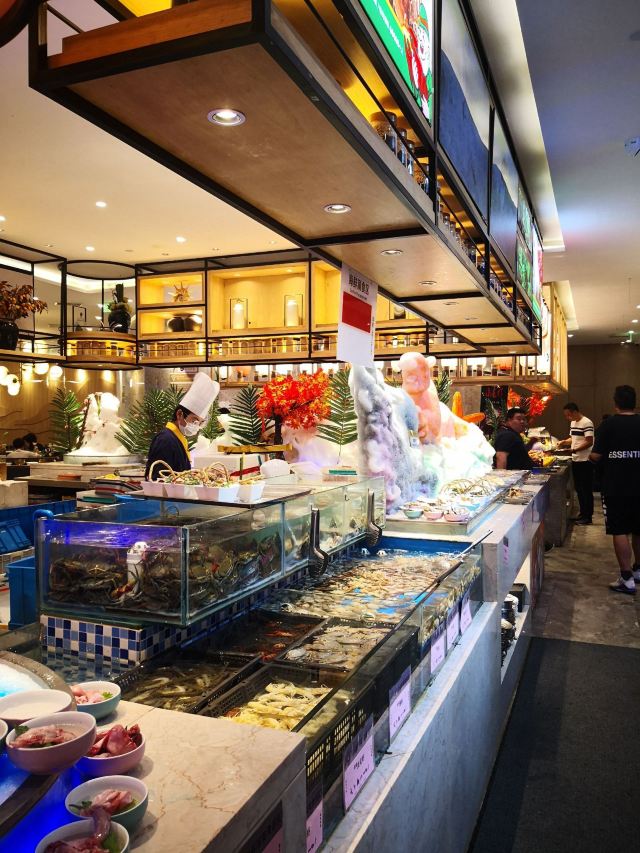 Sasa0828很久没有吃自助餐了 年前就种草了这家自助餐厅 去过的朋友都说不错 口碑也挺好的 提前一天电话预约了位置 店里面积挺大的 海鲜品种很多 东西看起来也很新鲜 食物选择性丰富 锅底类→只有三种选择(花胶鸡锅 麻辣锅和猪肚鸡锅) 海鲜类→小青龙 鲍鱼 生蚝 波士顿龙虾 阿拉斯加雪蟹 帝王蟹 海胆 牡丹虾 海鲜拼盘 北极贝等等 水果类→椰青 火龙果 芒果 荔枝 菠萝蜜 蜜瓜 榴莲等 烧烤类→烤羊排 羊肉串 铁板鳗鱼 烤乳猪等等 甜品类→提拉米苏 慕斯蛋糕以及各种芝士蛋糕 整体来说这家自助餐还是挺不错的 服务态度也很好 更换骨碟和收空盘子都很积极 自助餐没有时间限制 只要在营业时间内用餐都行 价格也还可以