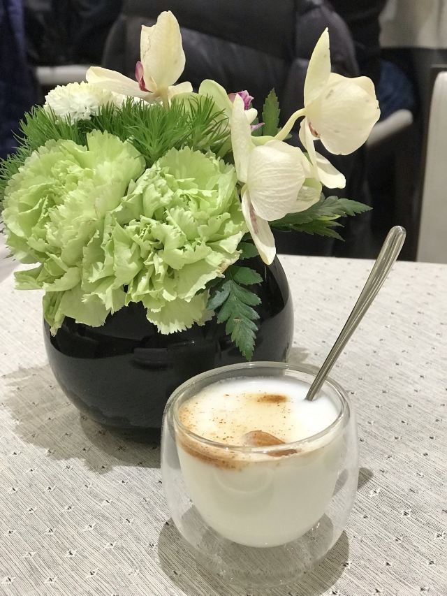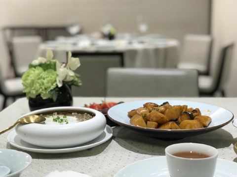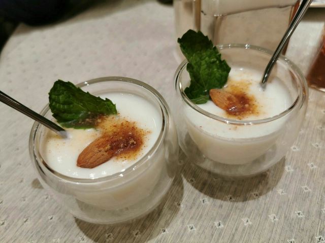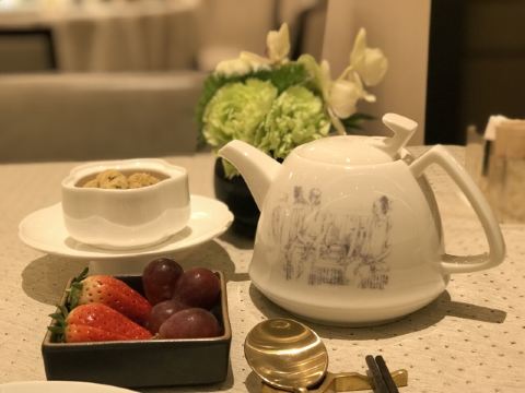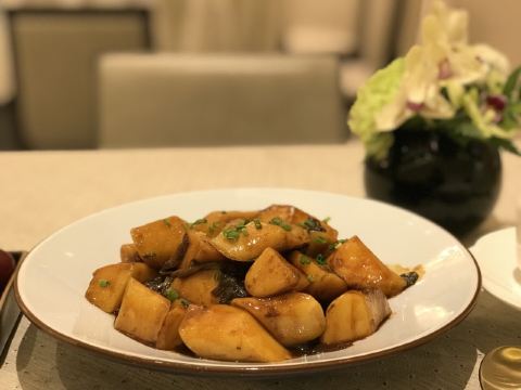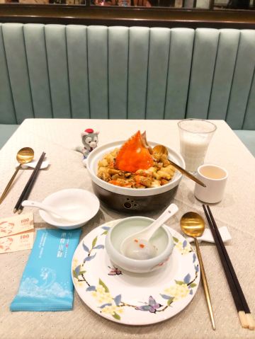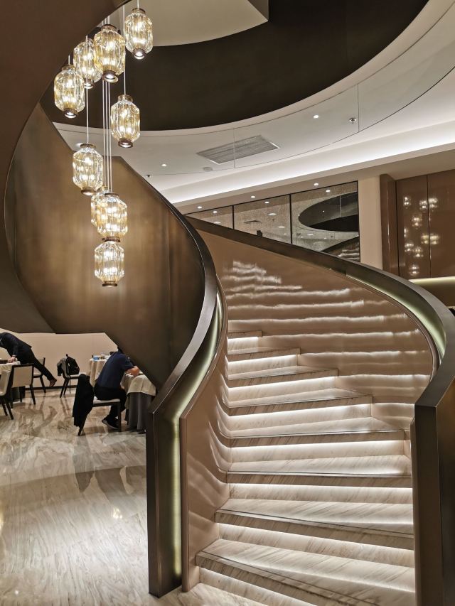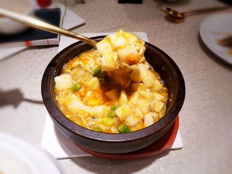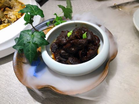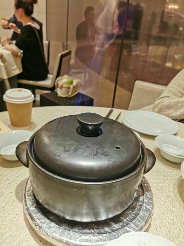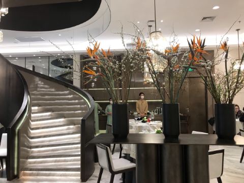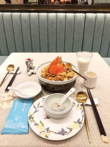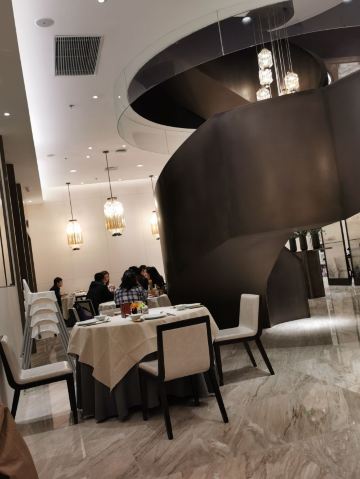 Kelly8501享用一个人的美食! 甬府·尊鲜一家位于陆家嘴国金中心的4楼的一家浙江菜餐厅,进入餐厅,展现在我们面前的是一个风格奢华的阔大空间,进口处黑色扶手的旋转扶梯,每级台阶都有散发出银白色的光采,天花板上华丽的吊灯,每个角度都折射出如梦似幻般的光芒。 每张桌子上均摆放着一个黑色的瓷花瓶,花瓶里绿色的花朵柔美地盛开,与周围华丽而又宁静的环境搭配得十分和谐。 一人食所以就点了两个菜,烤菜慈城年糕、土猪肉饼子炖土鸡蛋,甬府的烤菜年糕超好吃,一定要点,土猪肉饼子炖土鸡蛋也是非常入味,不愧是土猪肉,肉质特别香,两个菜口感都超赞,唯一可惜的是疫情期间,没有同伴同行,不然,人多一点,尝尝他家其他招牌菜,那就圆满了。 店家很热情,我才点了两个菜,他们倒是送了我四个菜,从水果(草莓、红提)到点心(四块杏仁酥)再到饮料(杏仁露)最后要买单了,又送上了酸奶,非常感谢,后会有期!