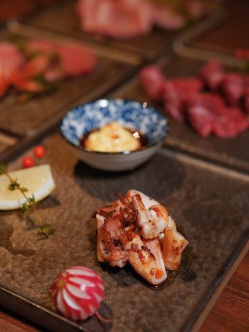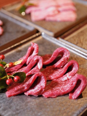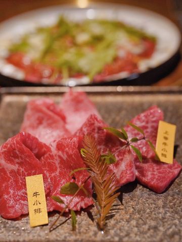 牛五花,土豆泥,雪花牛小排,昙石和牛外脊,厚切牛舌,烤年糕,蕃茄牛舌汤,和风豆腐,秘制香菇,薄切牛舌