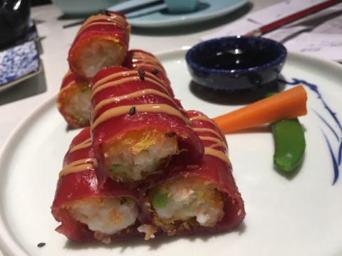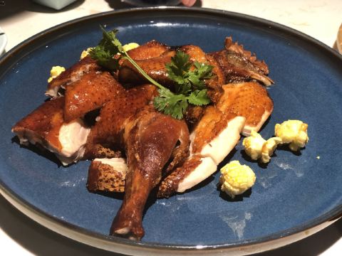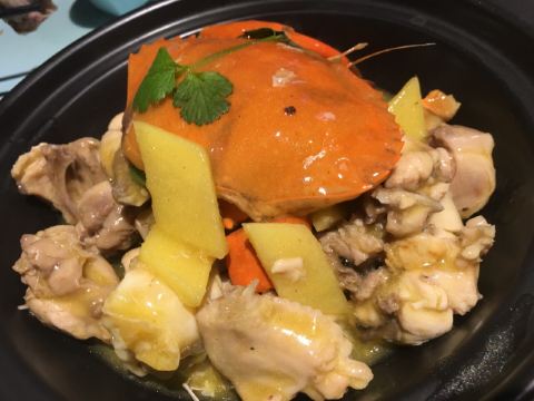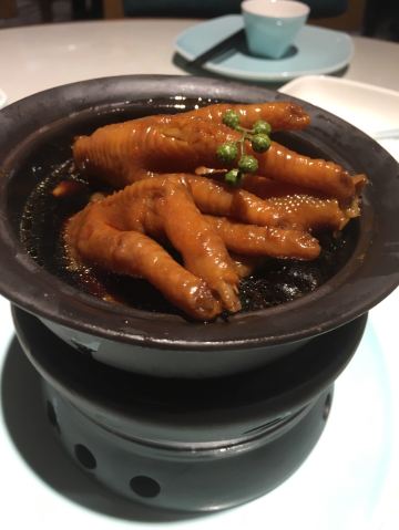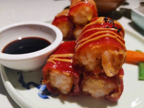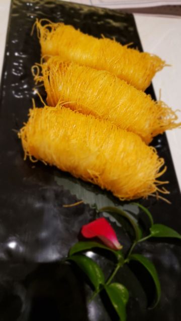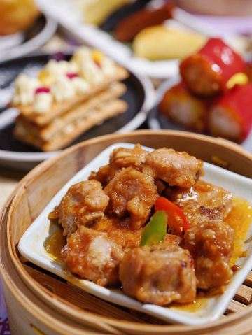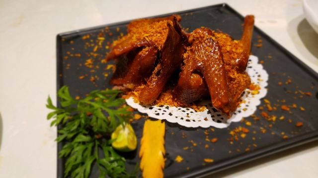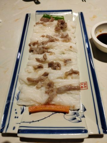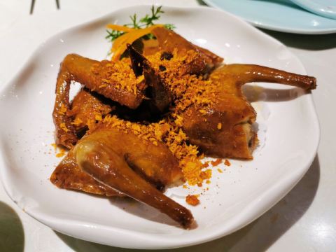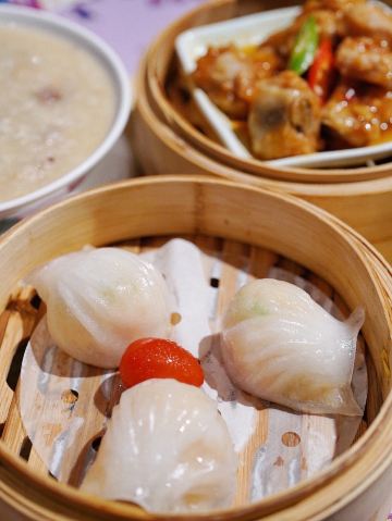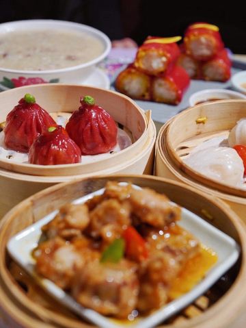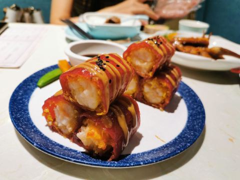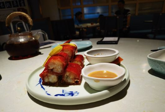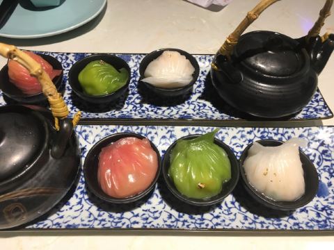 金莎海虾红米肠,桂花普洱茶,避风塘乳鸽,百合酱蒸凤爪,水晶三色虾饺,避风塘虾饺,荔湾舰仔粥,沙爹蒸金钱肚,干炒牛河,特色气泡猪手