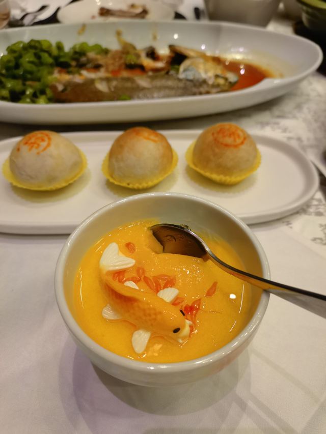 花开富贵鹅肝,黑蒜红烧鳗鱼 ,南瓜烧肉鲍鱼,香茅咖喱虾,蓝天手打面,清汤松茸炖绣球,金鱼甜品,葱油生态大黄鱼,特色麻香鸡,山楂鹅肝,鮰鱼狮子头