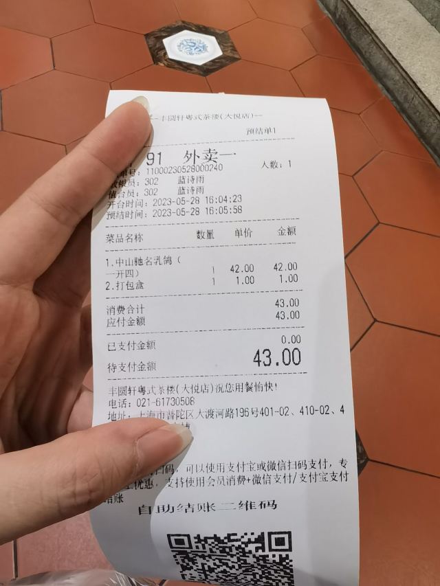 听足音丰圆轩粤式茶楼,在龙之梦购物公园中山公园店地下一层,属于传统的商业街区,还是地铁二、三、四号线中山公园站的上盖,2号口可以直接通往“龙之梦”地下一层,因此,丰圆轩粤式茶楼有着非常好的市口,加之美味,生意红火,经常要等位也就在情理之中了。这次会一会好久不见的退休老同事,特地十点就赶来用早茶。 两人胃口都不大,点了他家招牌的烤乳鸽、红米肠、虾饺皇、贵妃豆腐、白灼唐生菜。 1. 烤乳鸽烤得不老不嫩,吃起来肉入味,有汁水; 2. 红米肠里虾肉满满,一份的量比其他地方都多,性价比蛮高; 3. 虾饺皇,是他家招牌菜,外形饱满,染了鲜艳的桃红和嫩绿,表皮细腻轻薄,有玉质感,内里两三个大虾,鲜香扎实,吃起来非常有满足感; 4. 一篮贵妃豆腐,其实就是炸脆皮豆腐,外脆里嫩,口感不错; 5.白灼唐生菜,比较平淡,一笔带过。 他家最大的亮点在于每个餐桌上都有电蒸锅,虾饺皇等蒸点就在餐桌上现蒸,服务员根据食材定时,到点服务员会过来取出滚烫的蒸点,热气腾腾上桌。看着自己点的菜在面前蒸熟,很有期待感,通常吃起来也更香。另外,如果菜点凉了,也可以现蒸加热,非常方便。