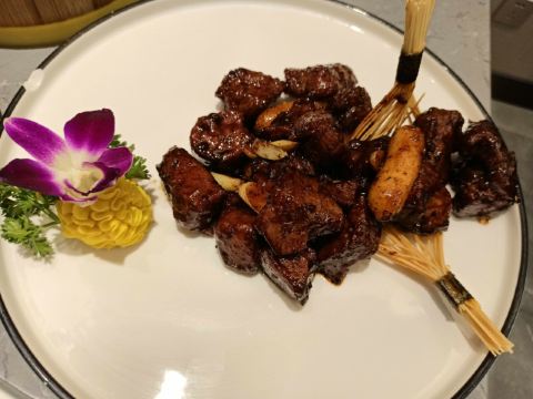 大理石山药,脆皮乳鸽,黑椒a级牛籽粒,鸡枞菌爆爽肉,荠菜黄鱼脯,大连鲍煨猪手,杨枝甘露,咖喱皇大虾,熟醉大虾,荷塘月色