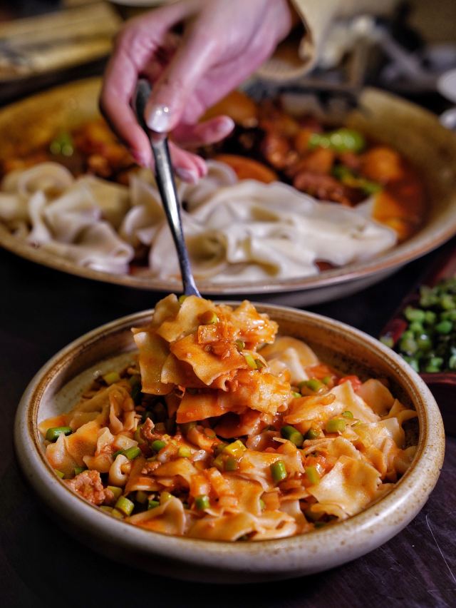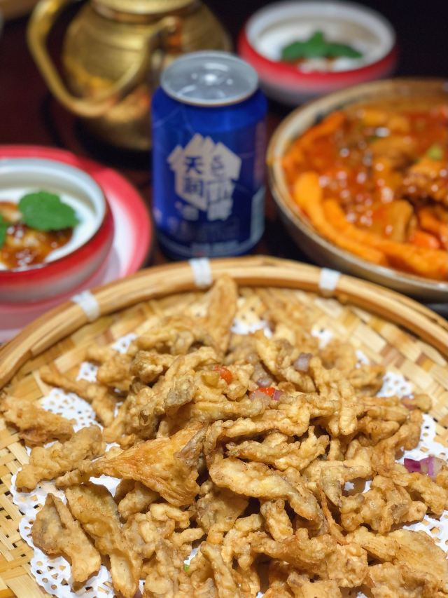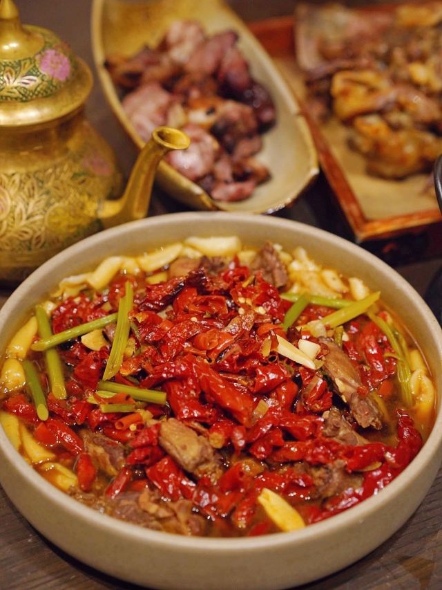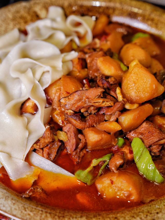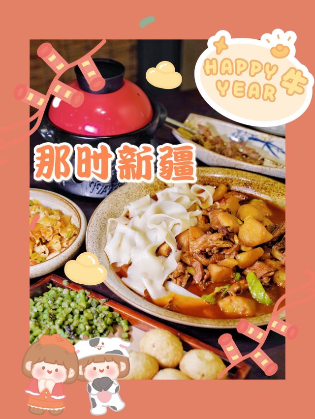 吃饭就别叫我了新疆面积广阔,资源丰厚,拥有得天独厚的地理环境与气候情况,也酝酿出了许多与众不同的食材与料理,新疆菜作为小众菜系,也能给人们带来不一样的美味体验! 每一家门店都充满了新疆当地的异域风情,七彩的玻璃灯罩,原木长条座,当地的红 色卷帘,都给人留下很深刻的印。 🫖新鲜现煮新疆奶茶🫖 新疆的奶茶是分为甜奶茶和咸奶茶,如果想品尝到当地特色,建议选择咸口的,新鲜现煮的奶茶喝起来不会感到太过甜腻,反而有 一股浓浓的奶香,一口喝下去回味无穷。 🥟烤包子🥟 新鲜的包子上桌热乎乎的,里面的馅料则是羊肉馅和洋葱碎,新疆的羊肉吃上去不会有膻味,洋葱则起到很好的解腻作用,还能增加口感层次,轻轻咬上一口汁水十足💦 🍗新疆大盘鸡🍗 来新疆餐厅怎能不点大盘鸡?作为当地的特色美食,对鸡肉的处理有很大不同,浓郁的调味再配上土豆与面食,满满当当一大盘,足够3~4人同时享用,鸡肉肉质紧致,宽面筋很有嚼劲,土豆煮得酥烂入味。