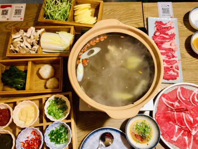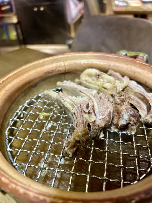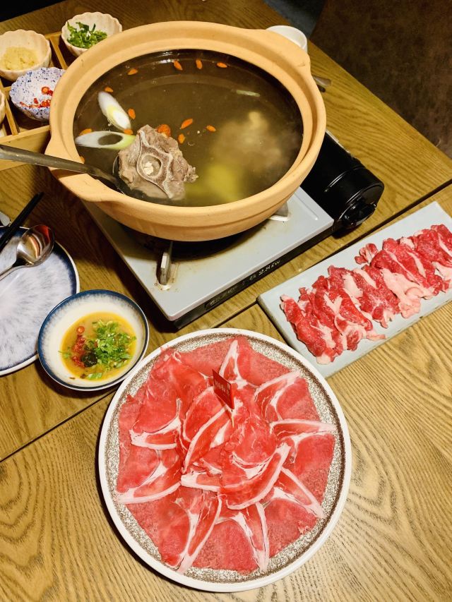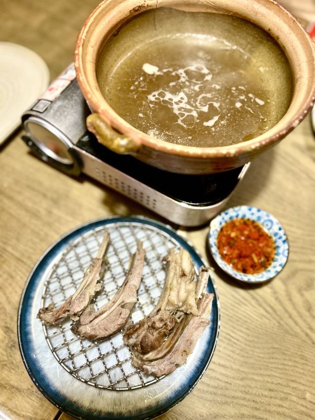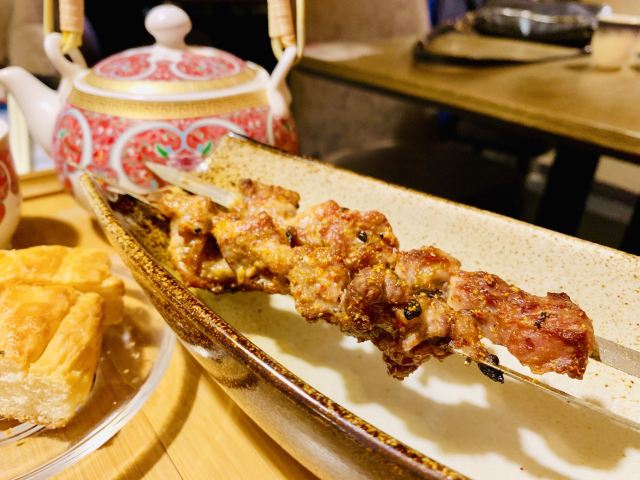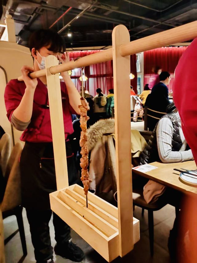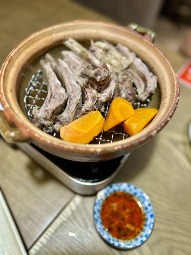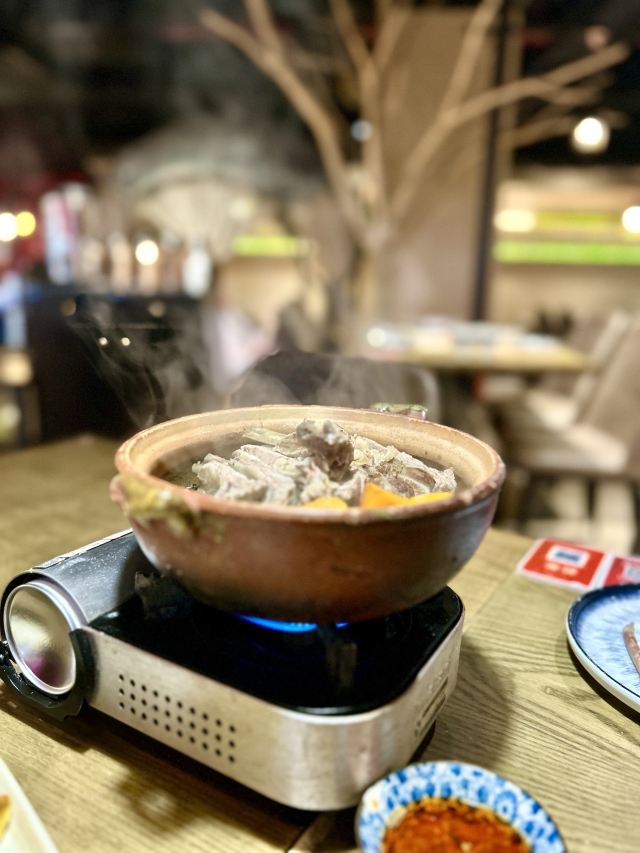 Yolanda_zy店里每天饭点就排队,特地电话了解到,5点之前到一般不会排队,就早早的去吃晚饭了,果真5点过后全坐满。每桌都会上的新疆奶茶,大冬天进门喝上一杯特别暖心,淡淡的咸味好喝[调皮]火炉羊肉非常喜欢,砂锅里牛脊椎汤底,涮的热气羊肉和M6牛肉量很足,品质也不错,搭配调制好的花生酱料,也可根据个人喜好添加六小料,肥瘦相间的涮羊肉蘸上花生酱[色]店里还专门搭配了糖蒜2颗,和冰糖话梅小番茄特别解油腻,绝配[强]尝了两串羊肉串微辣的好吃😋不过瘾又点了一大串(49元),说是馕烤的,上来的架势有点震撼[偷笑]饭后甜点不可少,手工酸奶配上蜂蜜葡萄干,酸甜可口[愉快]