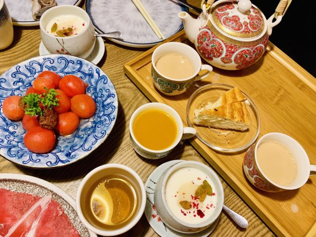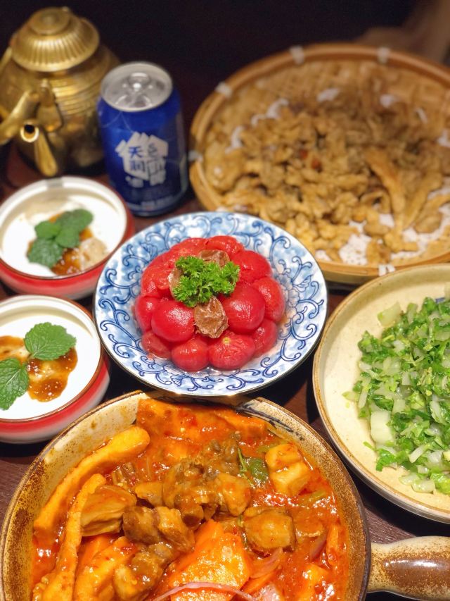 新鲜现煮新疆奶茶,新疆大盘鸡,碳烤羊肉串,乌梅小番茄,恋爱中的古丽,手抓羊肉,新疆羊肉烤包,西域馕炒肉,哈密瓜酸奶沙拉,火炉羊肉