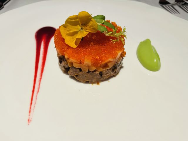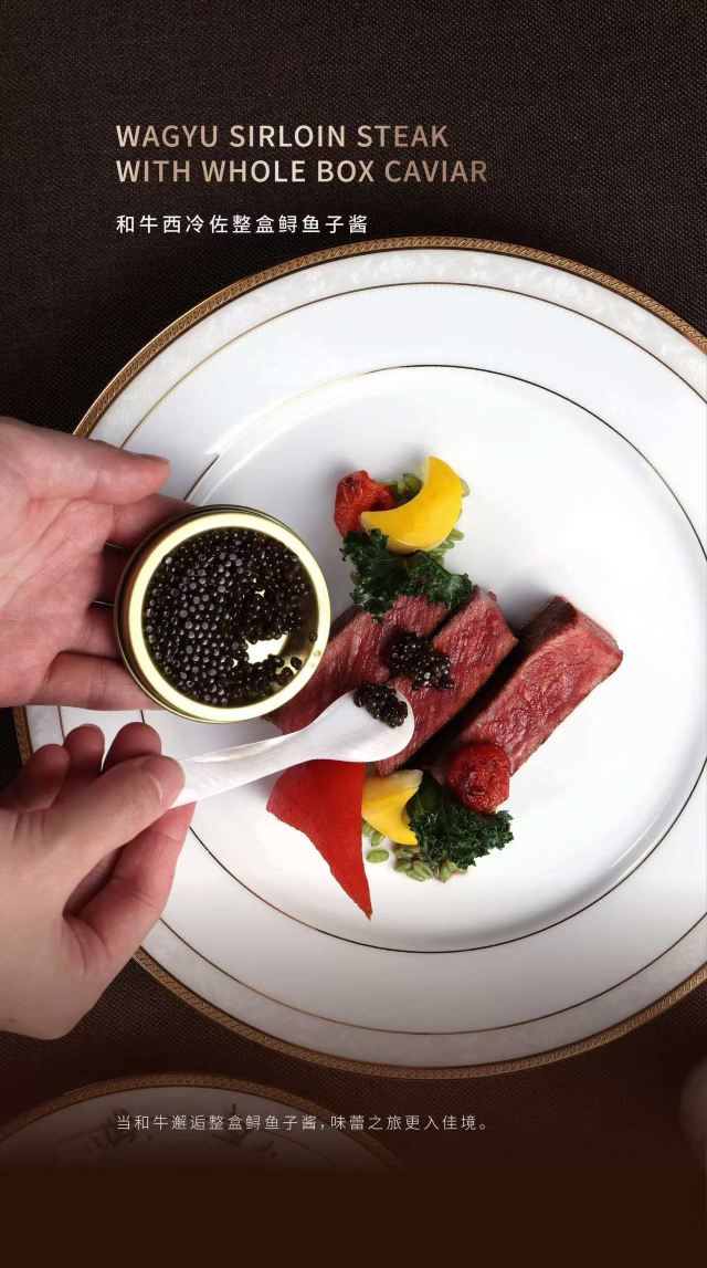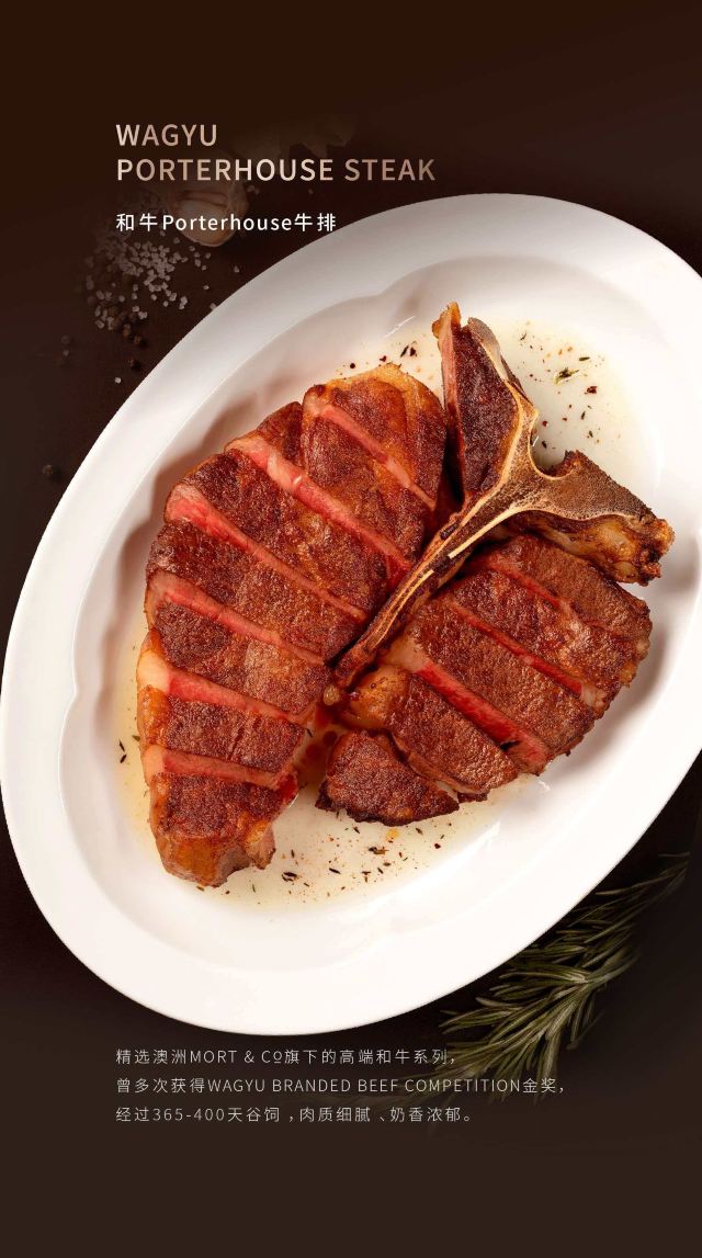 和牛porterhouse牛排,美国Prime级王品牛排,飞天茅台火焰活鲍鱼,手剥帝王蟹肉TAPAS,西班牙5J火腿鲜果沙拉,现萃咖啡提拉米苏,鱼子酱糖心鹌鹑蛋,三文鱼子和牛塔塔,Porterhouse牛排,谷饲牛肉刺身,香煎帝王蟹饼,慢炖牛排清汤,法式芒果布蕾,开心果拿破仑千层