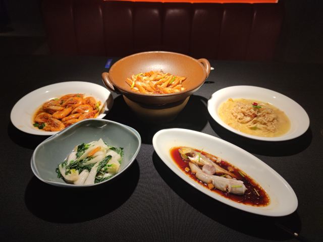 花胶黄鱼羹,手拆蟹黄豆腐,家烧东海黄鱼,沙蒜豆面,茅台蒸梭子蟹,板栗烧原味仔排,燕窝绿豆糕,原味仔排,五福拼盘,清炖梅童鱼拼水潺